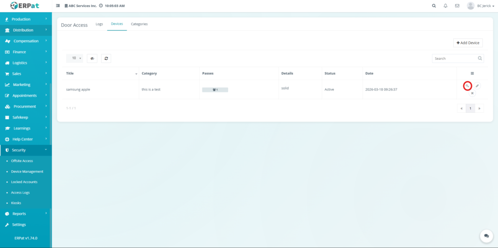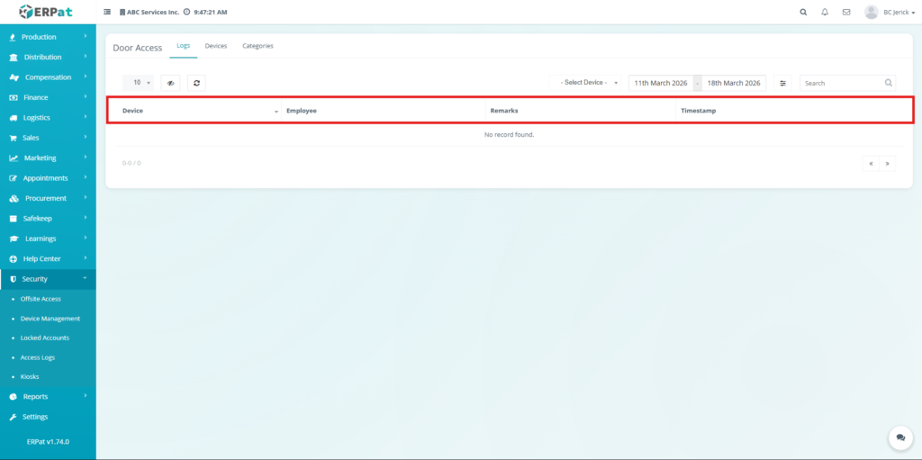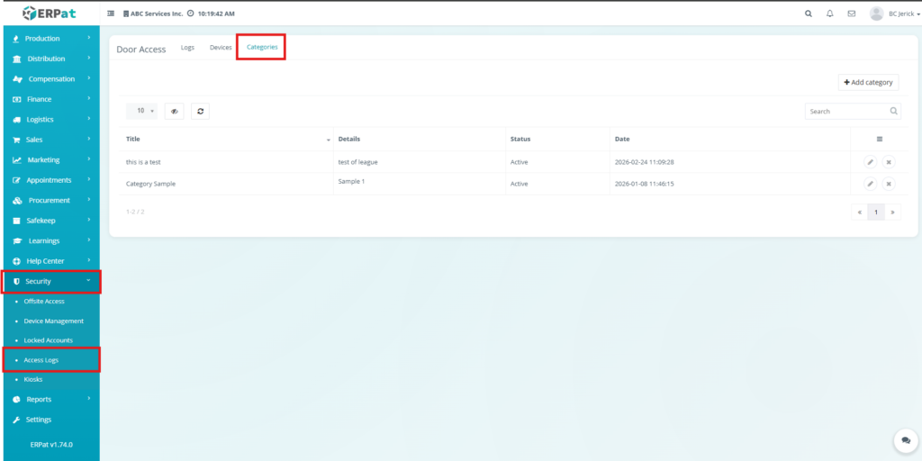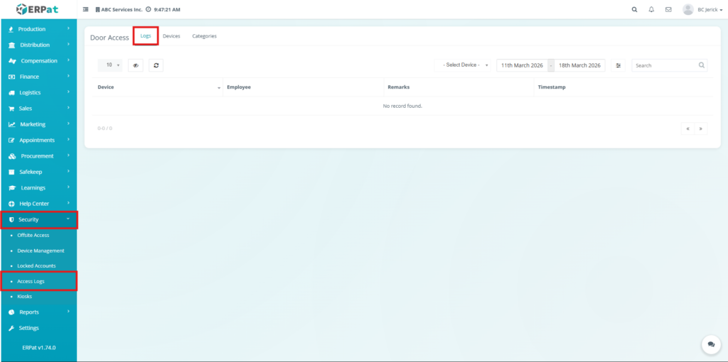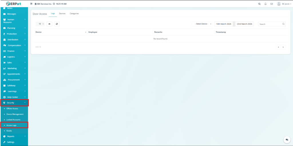 You will be directed to the Door Access module with Logs, Devices, and Categories tabs.