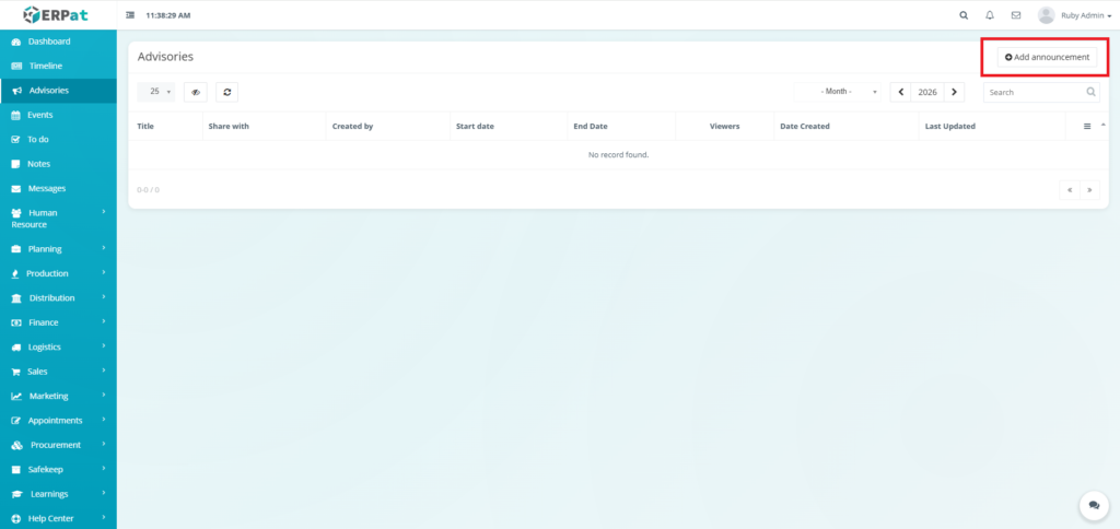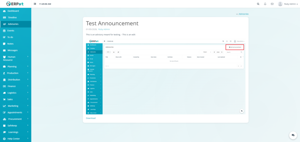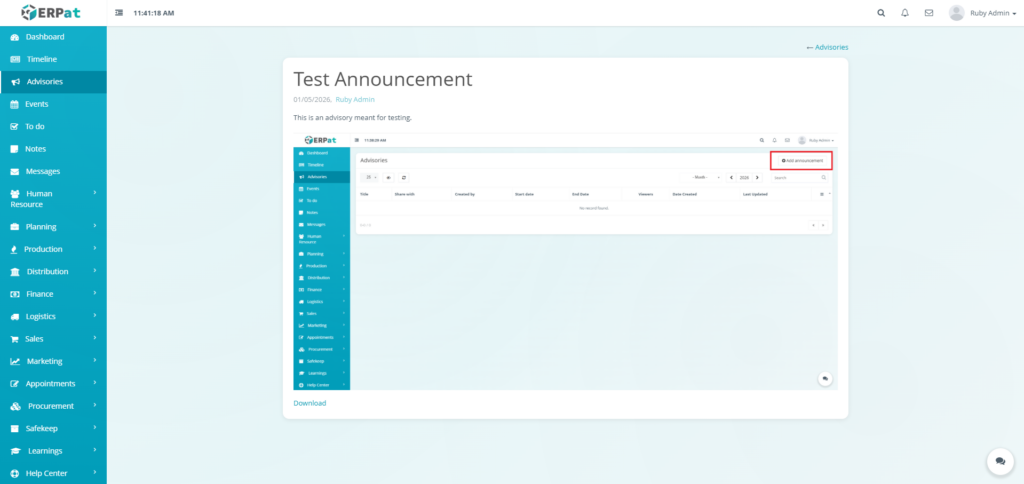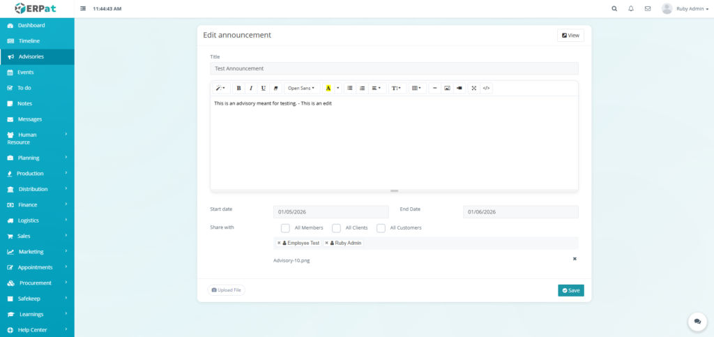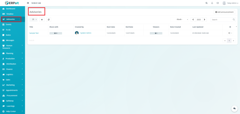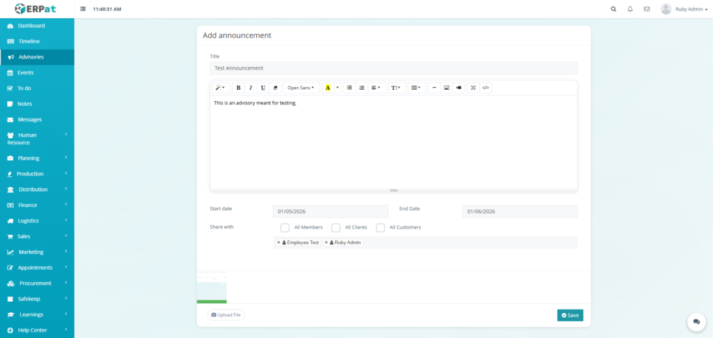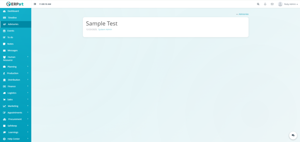 The Advisories Module is a centralized notification and announcement system within the ERPat platform that allows authorized users to create, share, and manage important advisories across the organization. It serves as a formal communication channel for distributing time-sensitive information, policy updates, system alerts, and organizational announcements to targeted audiences.