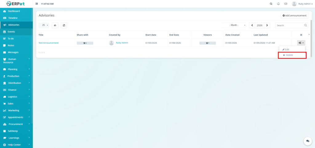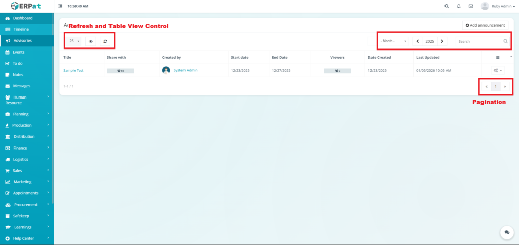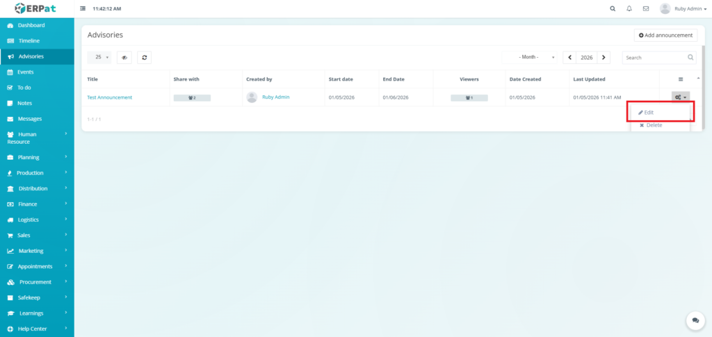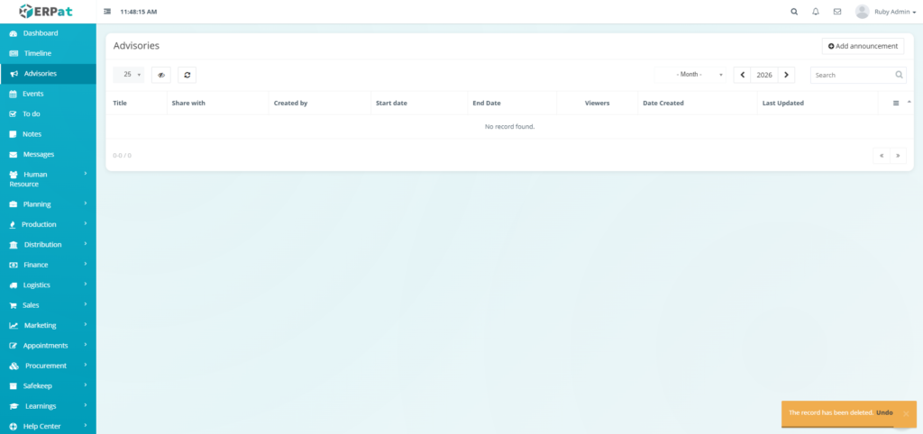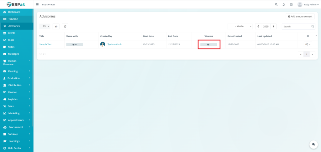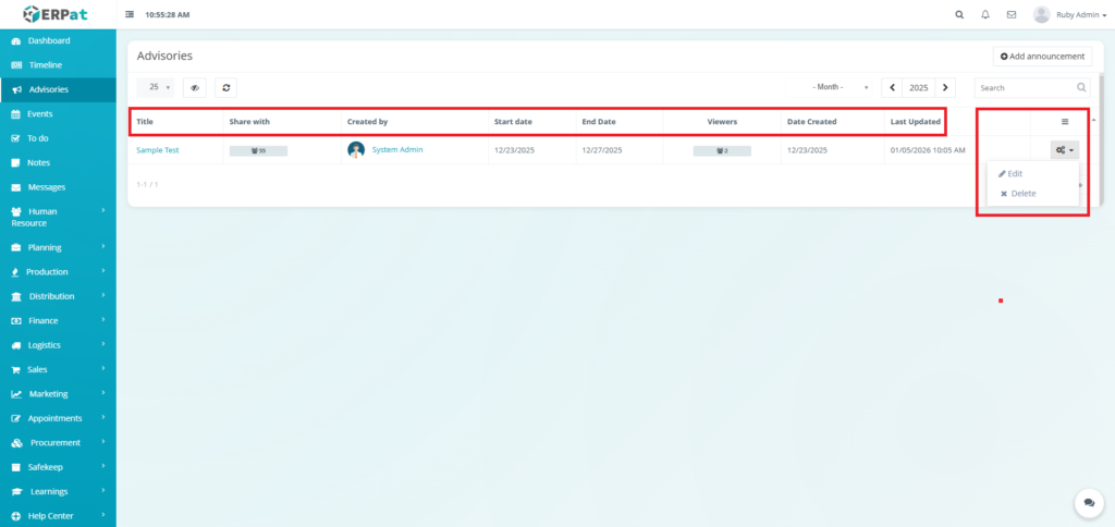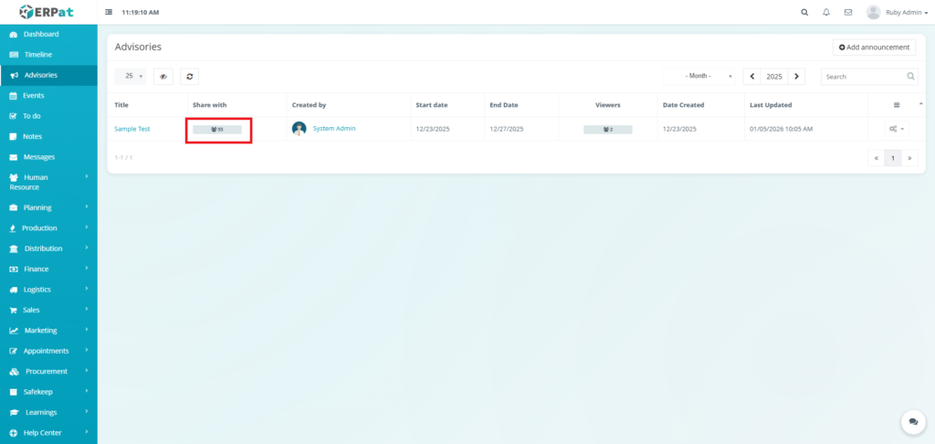The Advisories Module is a centralized notification and announcement system within the ERPat platform that allows authorized users to create, share, and manage important advisories across the organization. It serves as a formal communication channel for distributing time-sensitive information, policy updates, system alerts, and organizational announcements to targeted audiences.