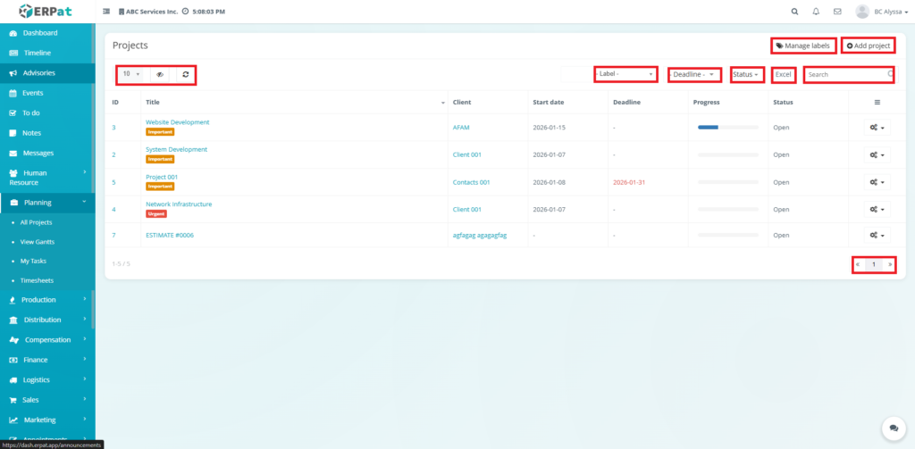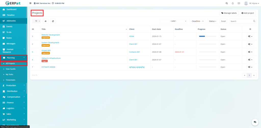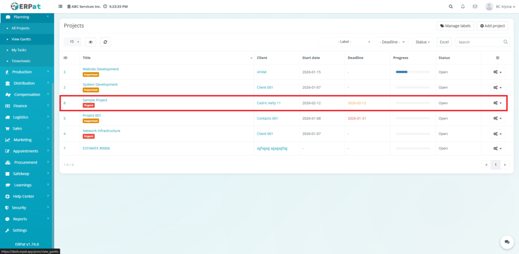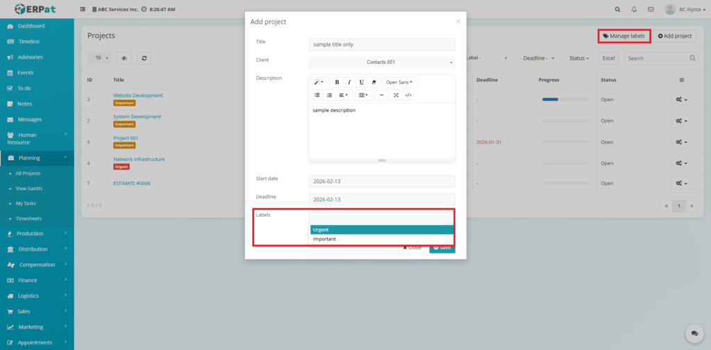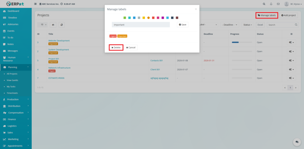Labels help categorize projects by priority or type (e.g., Important, Urgent).