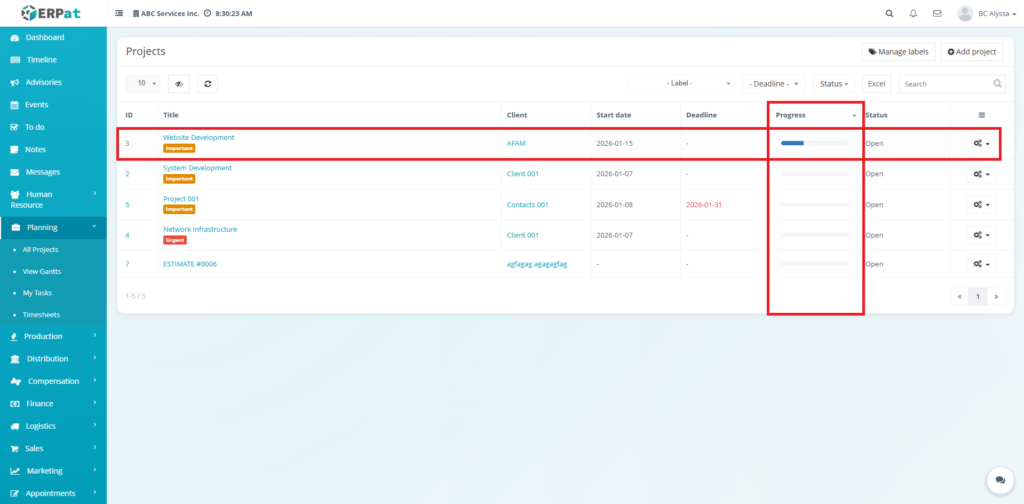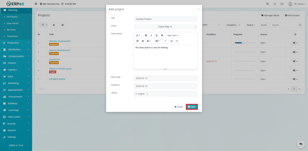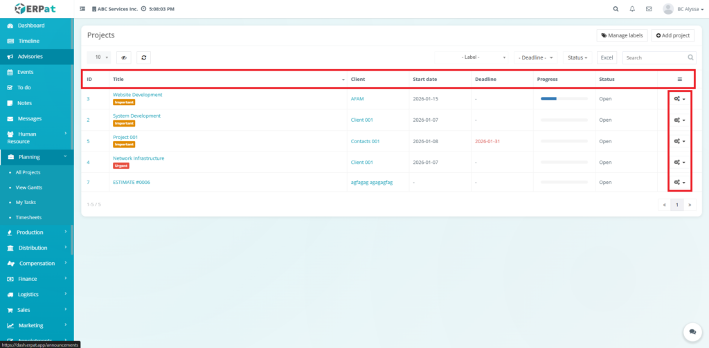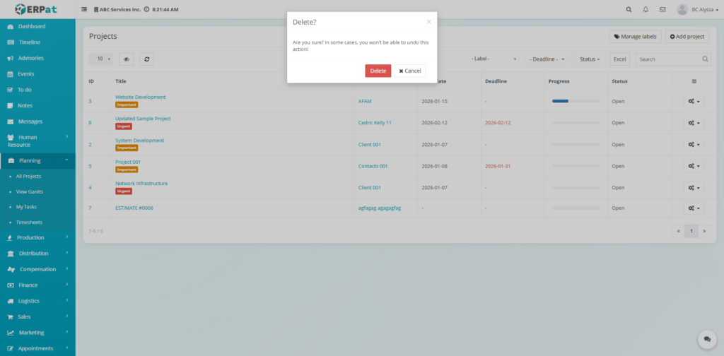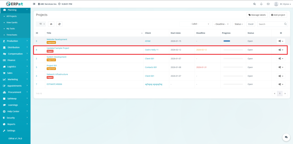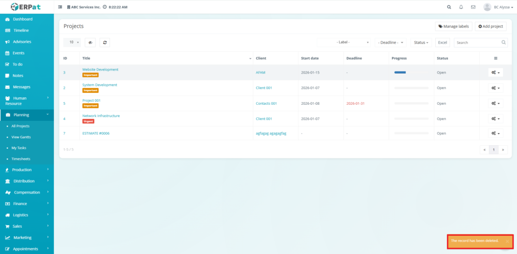 All create, update, and delete actions within the Projects Module are logged for audit and compliance purposes within the ERPat System.