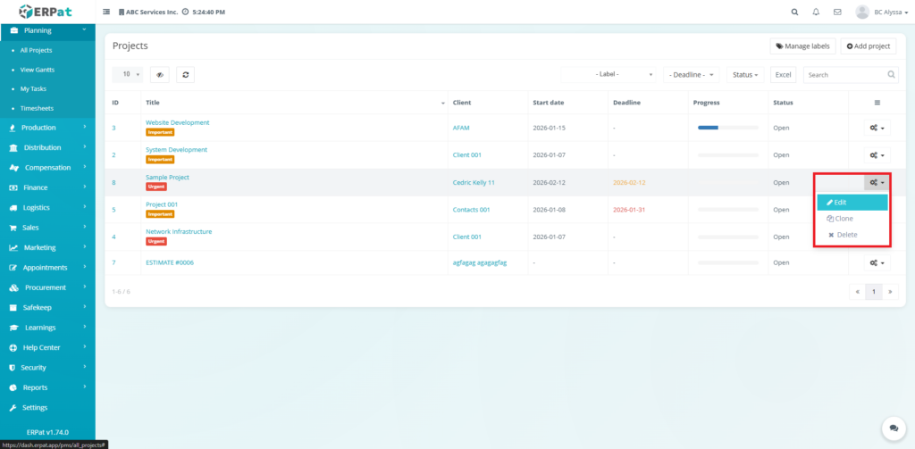 • Actions – Options menu for Edit, Clone, and Delete
