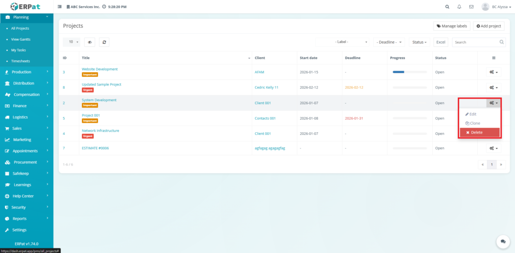 Notes: Deleting a project may remove associated tracking data. Ensure the project is no longer active before deletion.