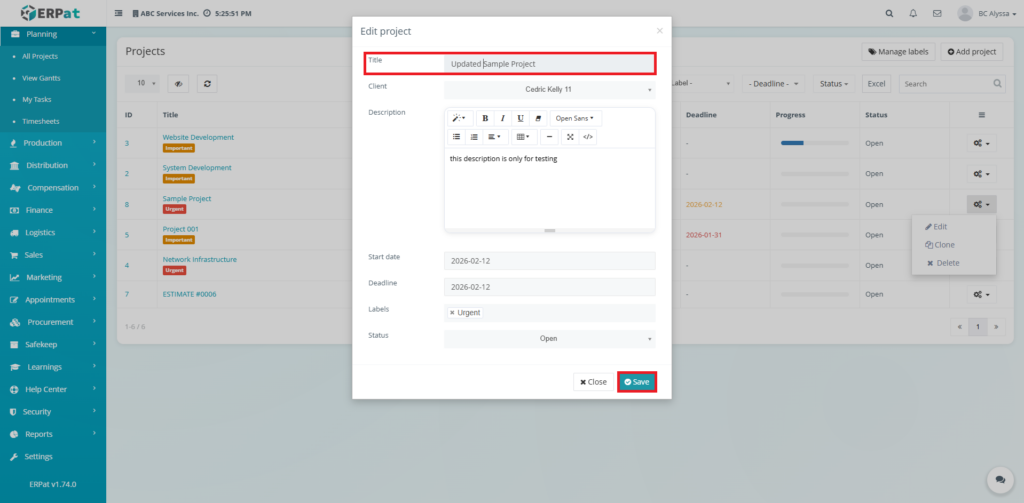 • Updates will immediately reflect in the project listing.