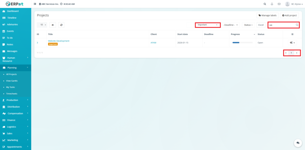 • Use the Search field to find projects by title or client.