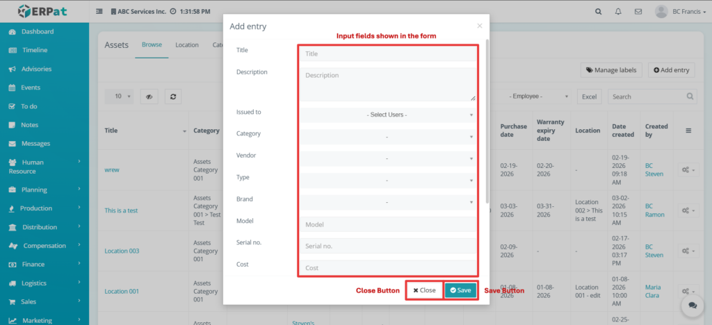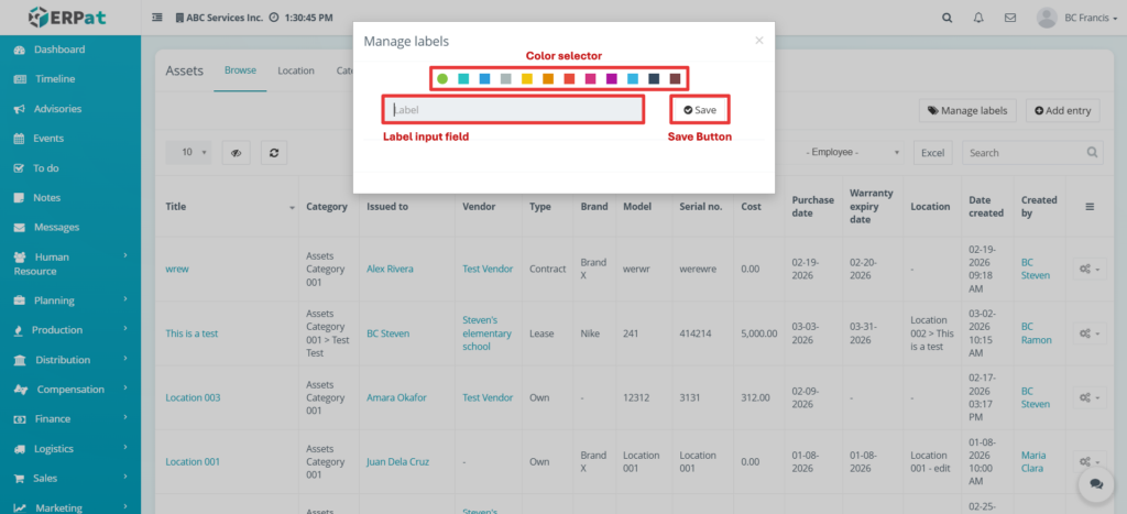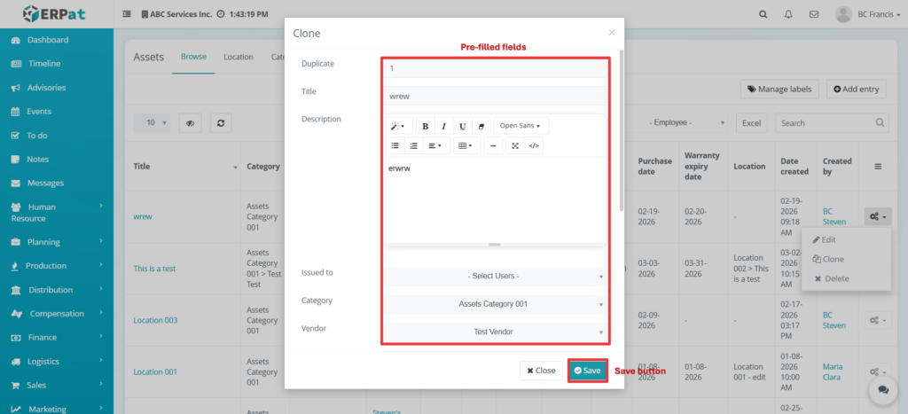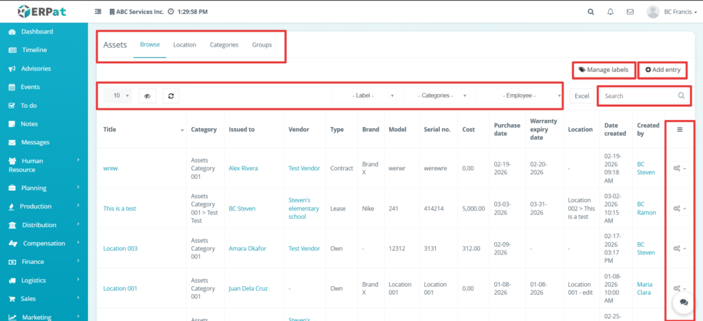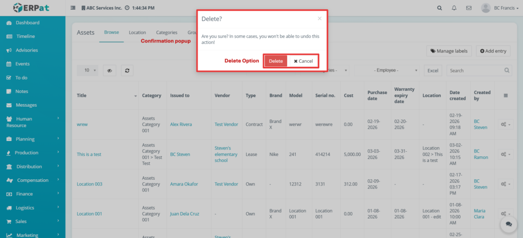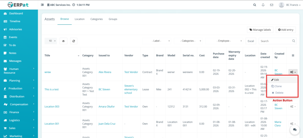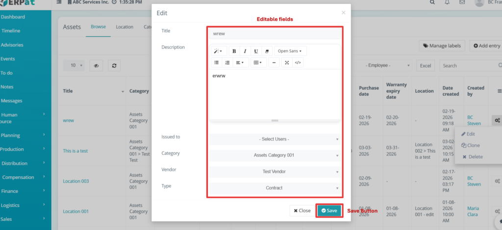 All asset-related actions are logged with timestamps and user attribution for monitoring and compliance.