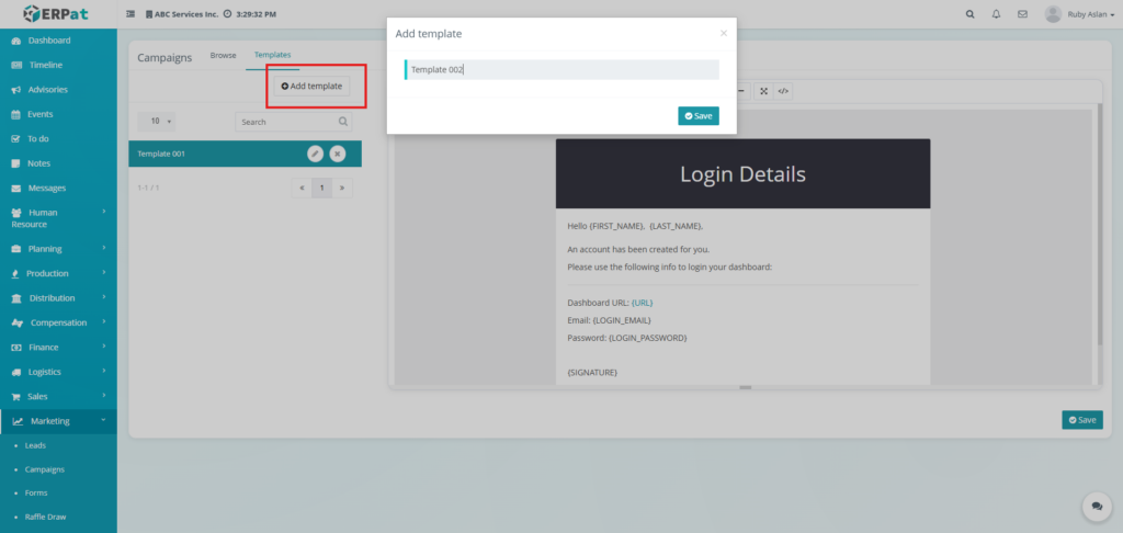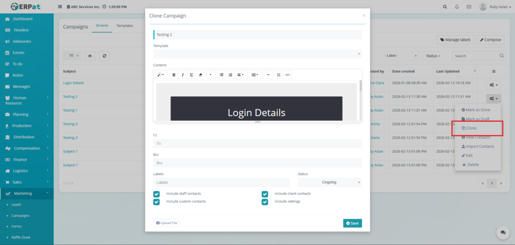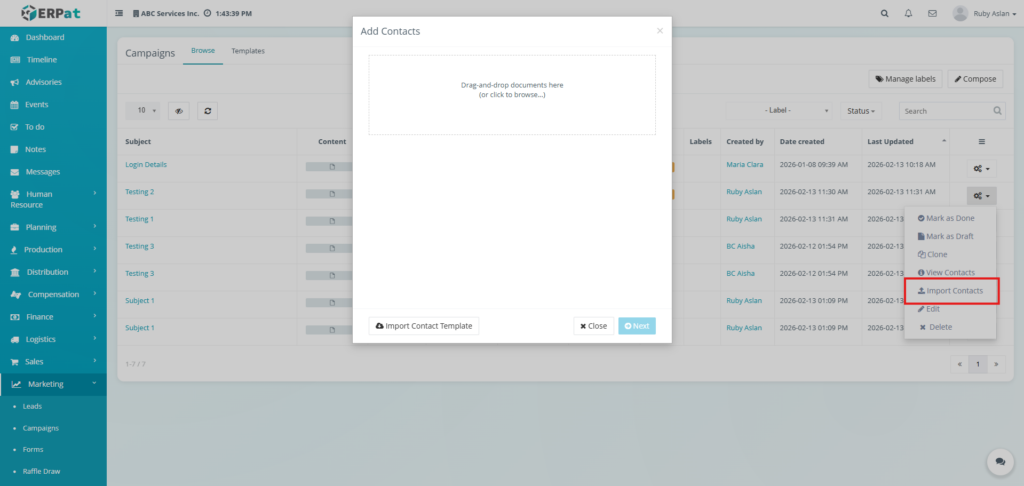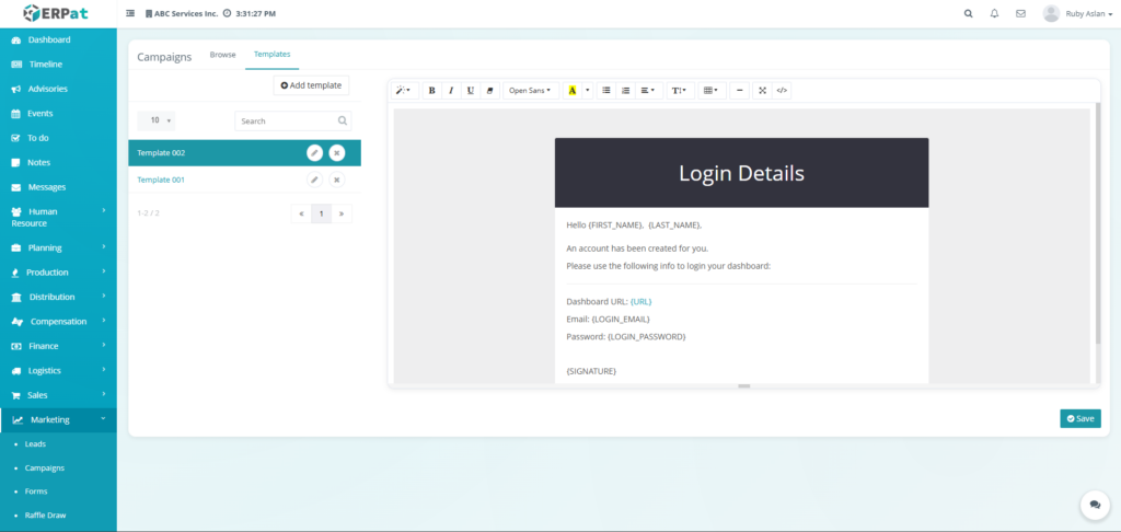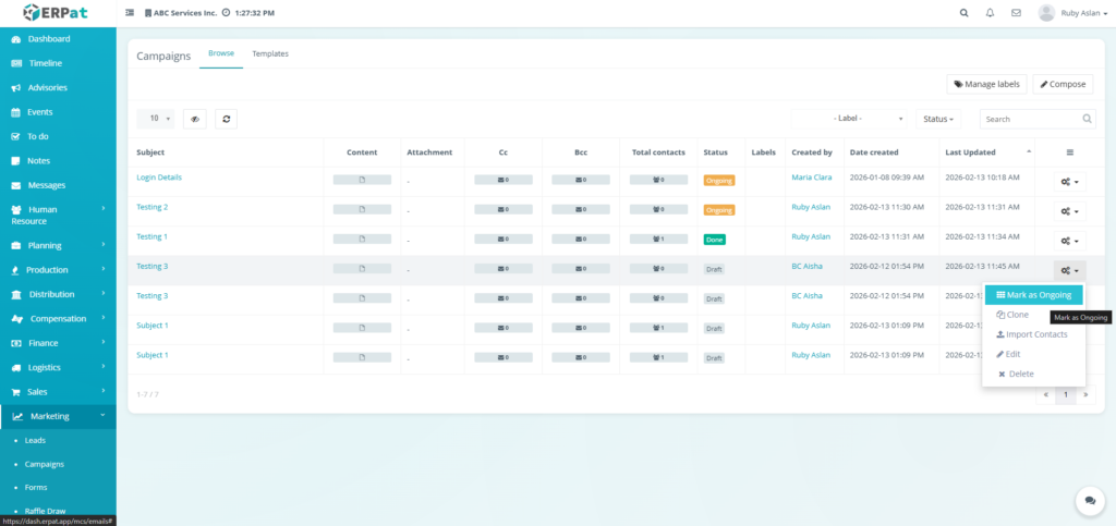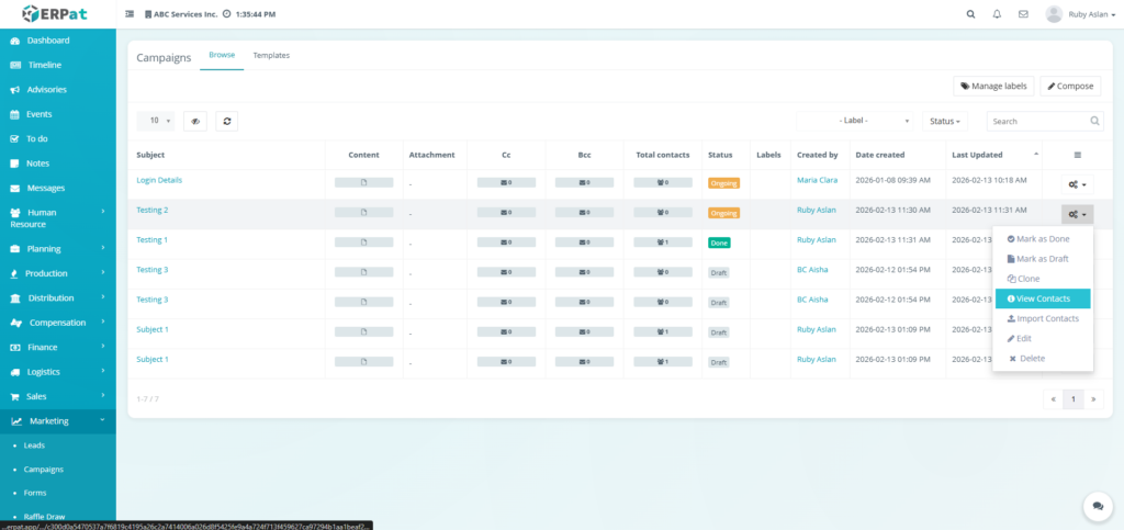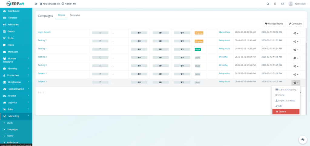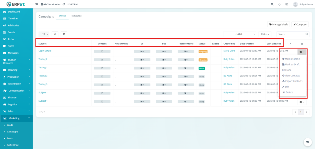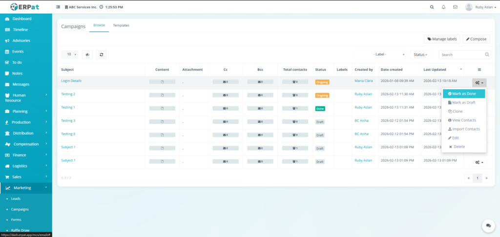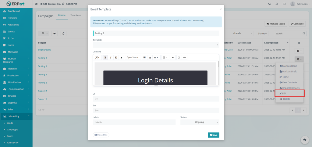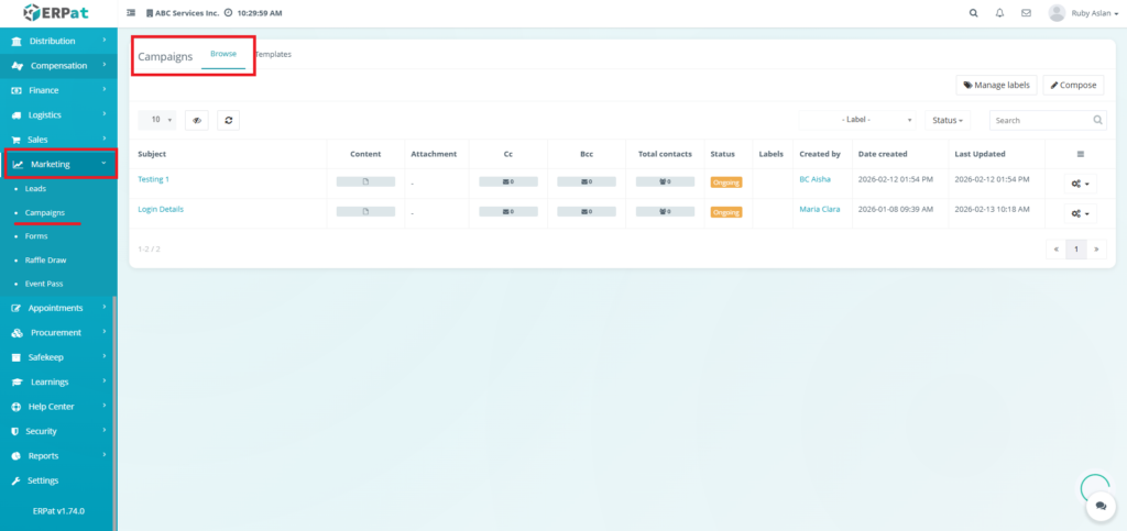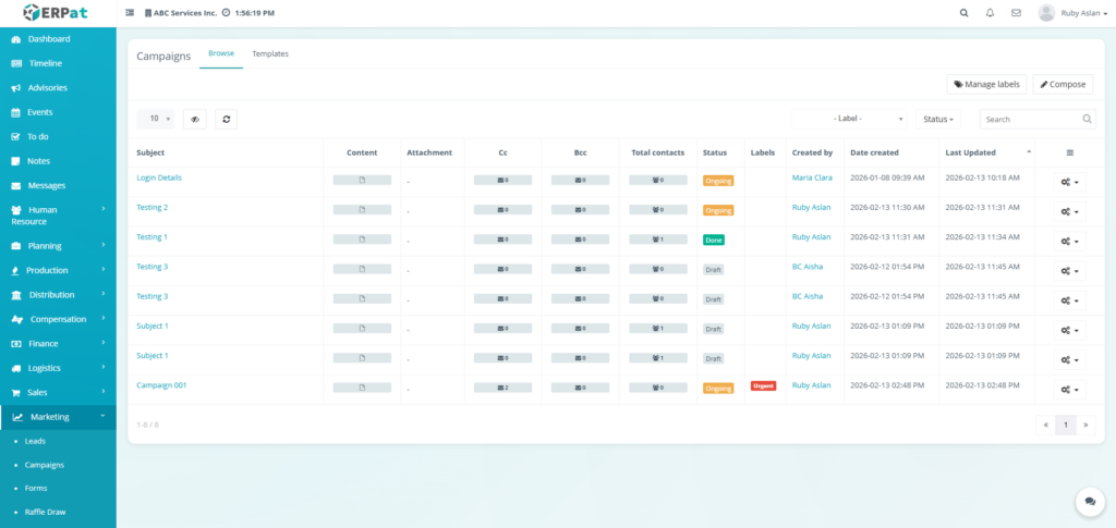 The Email Campaigns Module allows users to create, manage, organize, and monitor email campaigns and reusable email templates within the ERPat System. It provides tools for composing campaigns, attaching recipients, managing labels, tracking campaign statuses, and organizing templates for repeated use. Users can browse campaign records, filter and search entries, and maintain structured communication workflows.