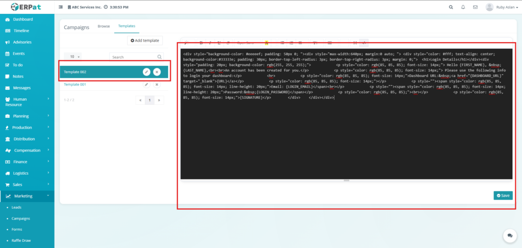 - Click the Save button to save the changes added to the template