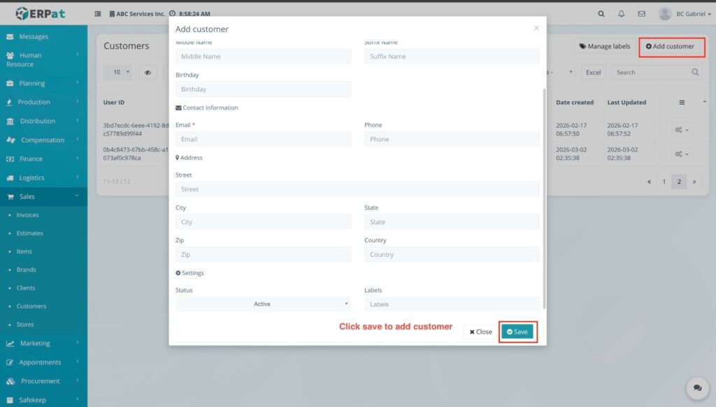 - Fill in the required fields in the Add customer modal: