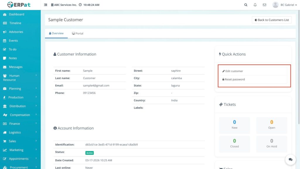 - To Edit: Click the Edit customer button. Update the necessary fields in the modal and click Save.