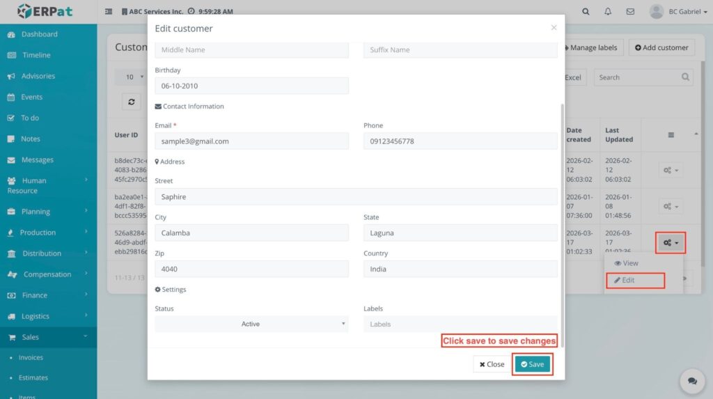 - Update the necessary information in the Edit customer modal, such as: