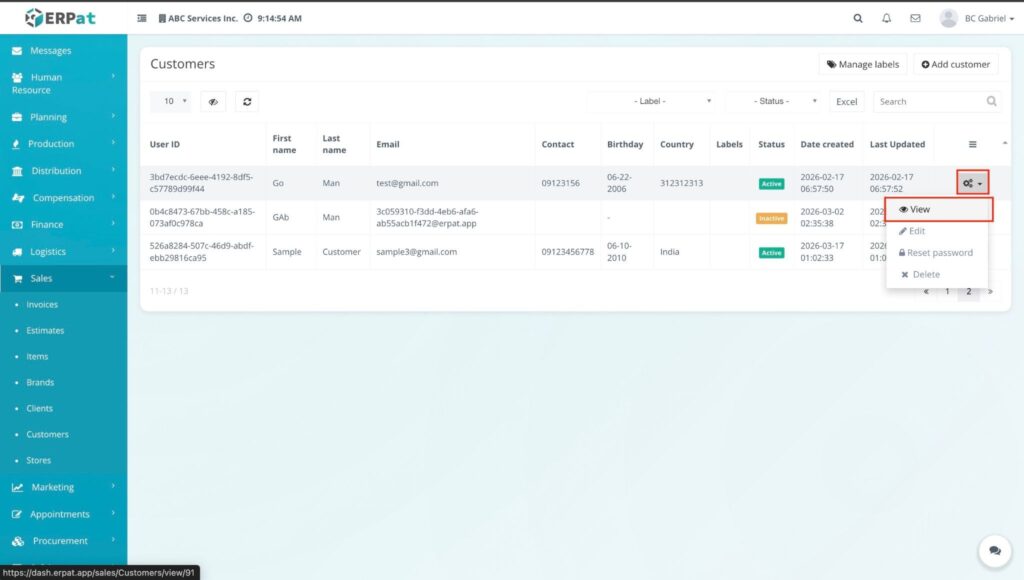 - Select View from the dropdown menu to open the customer profile page.