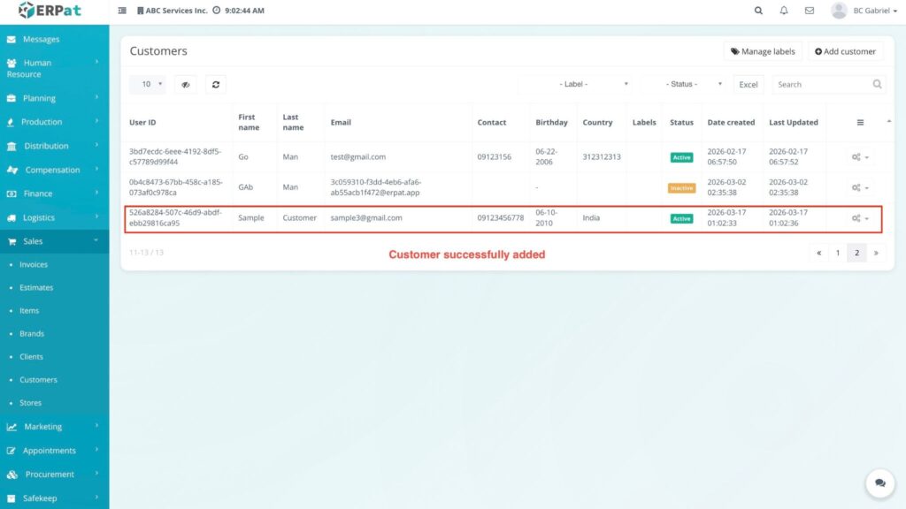 The modal closes and the new customer record is instantly visible in the Customers listing table.