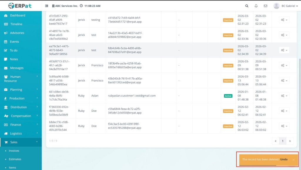 - Undo Action: If you deleted a record by mistake, you can click the Undo button within the notification at the bottom right to restore the customer record immediately.