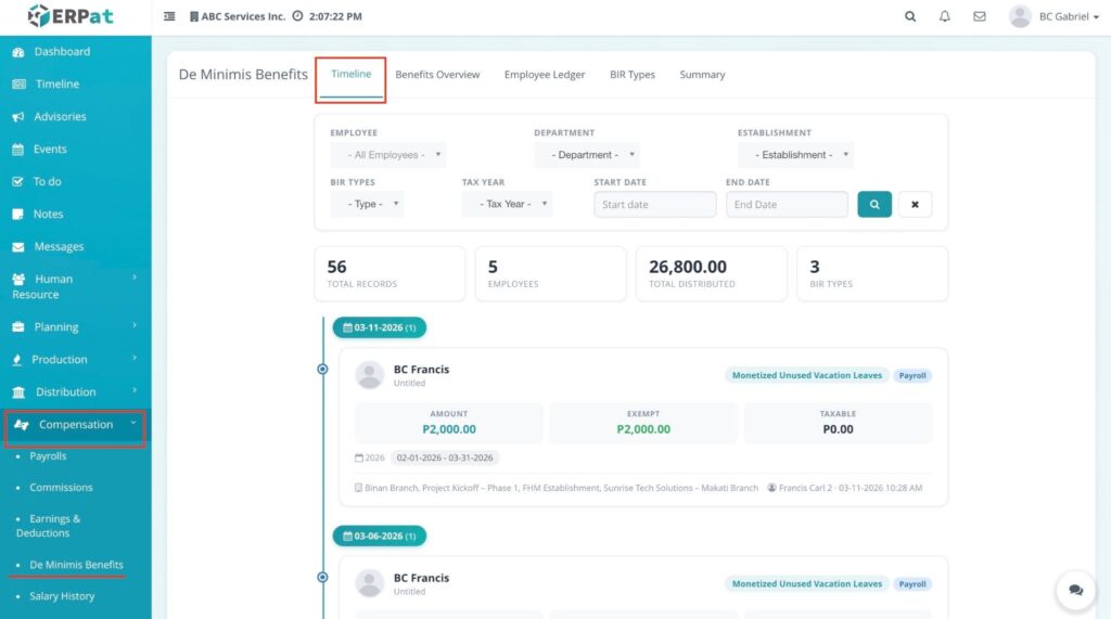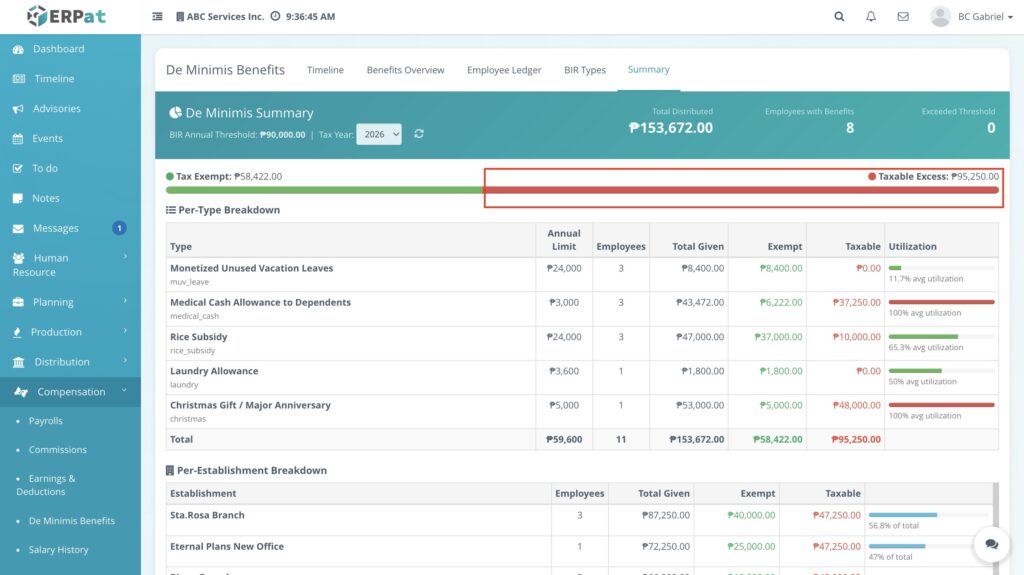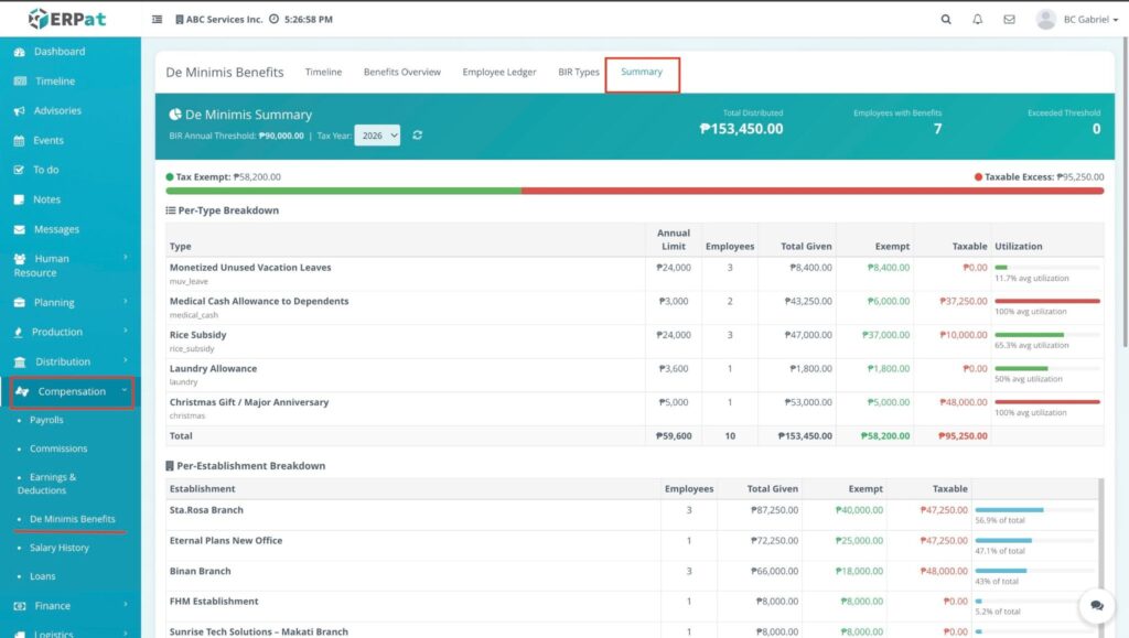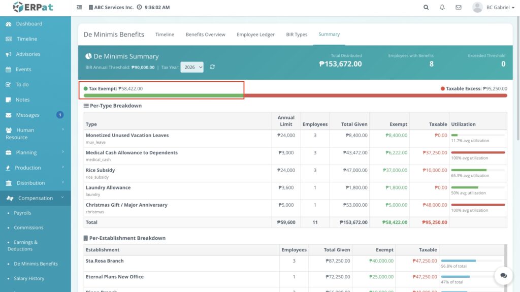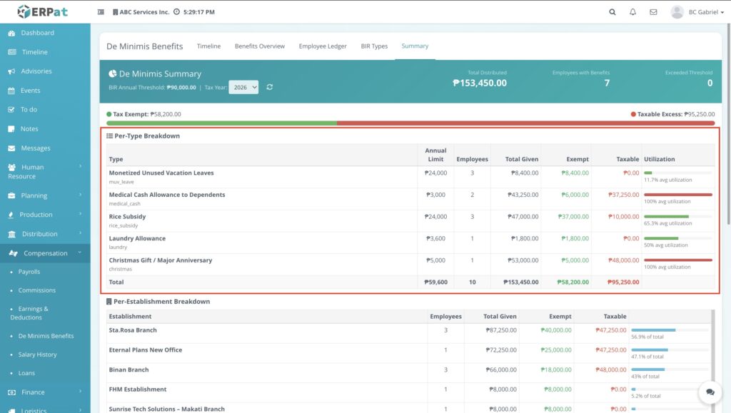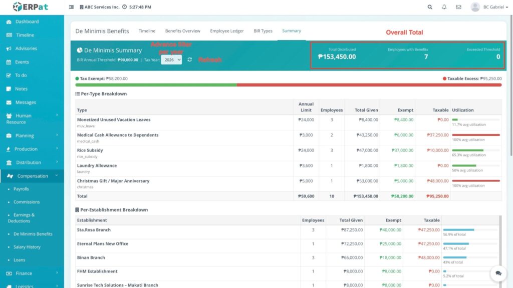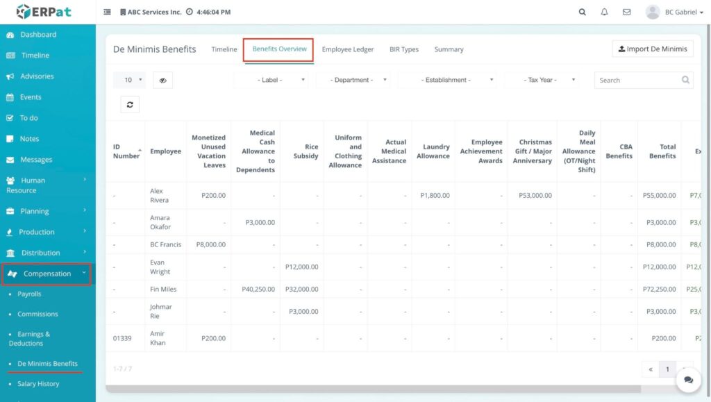 The overview page provides a detailed matrix of all distributed de minimis benefits with the following information: