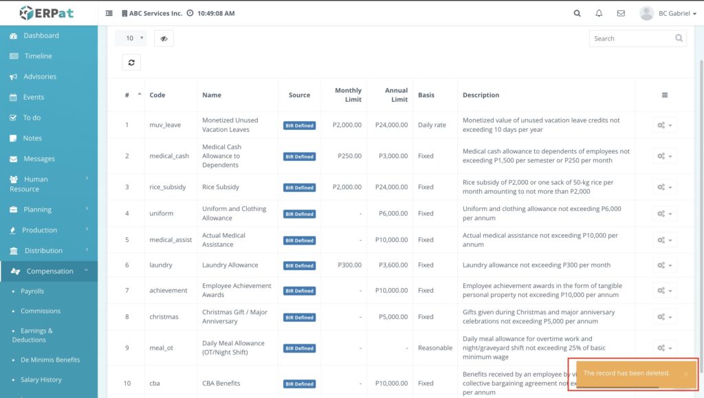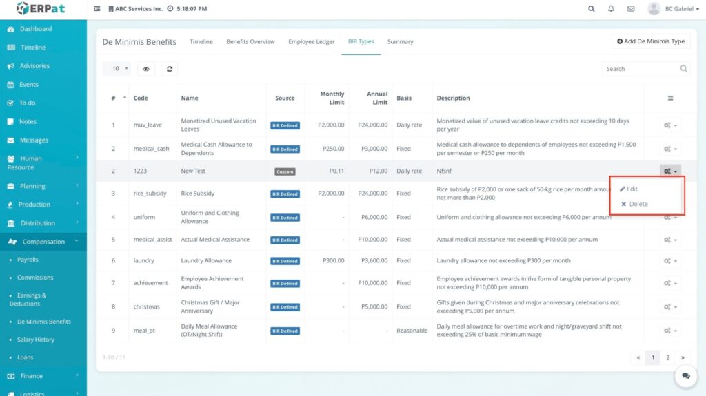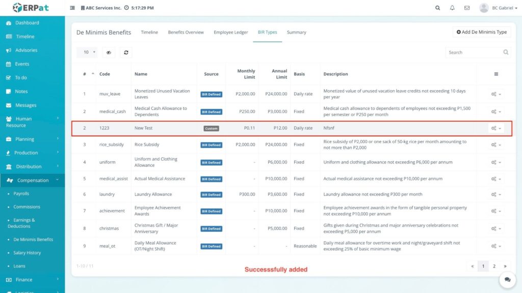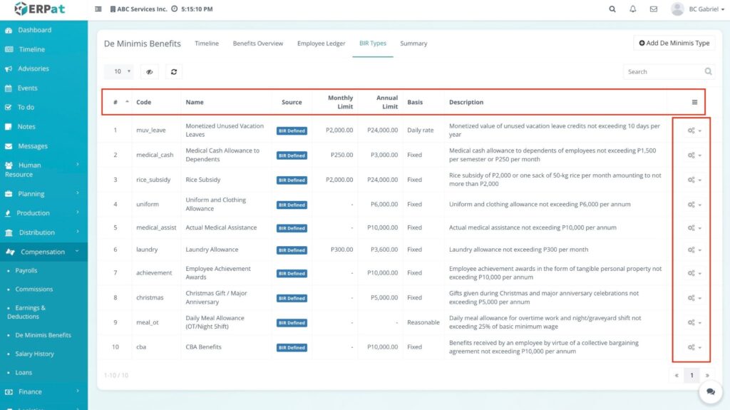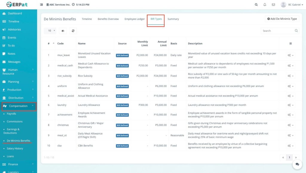 - Click on the BIR Types tab. This section serves as the configuration center for all benefit categories and their tax-exempt ceilings.
