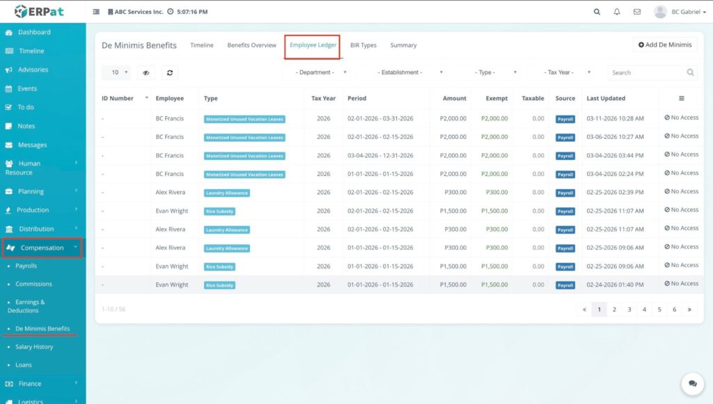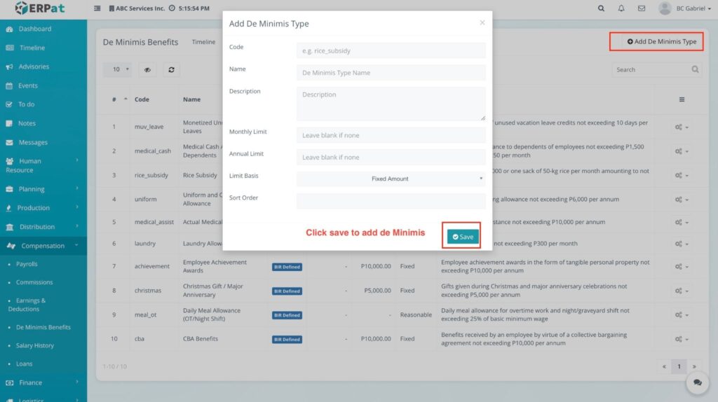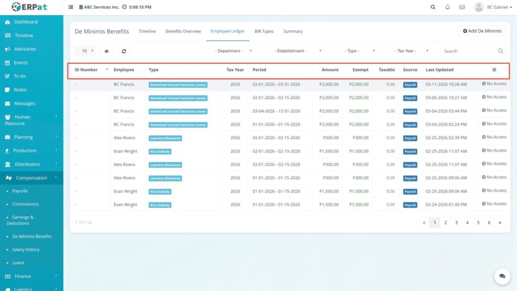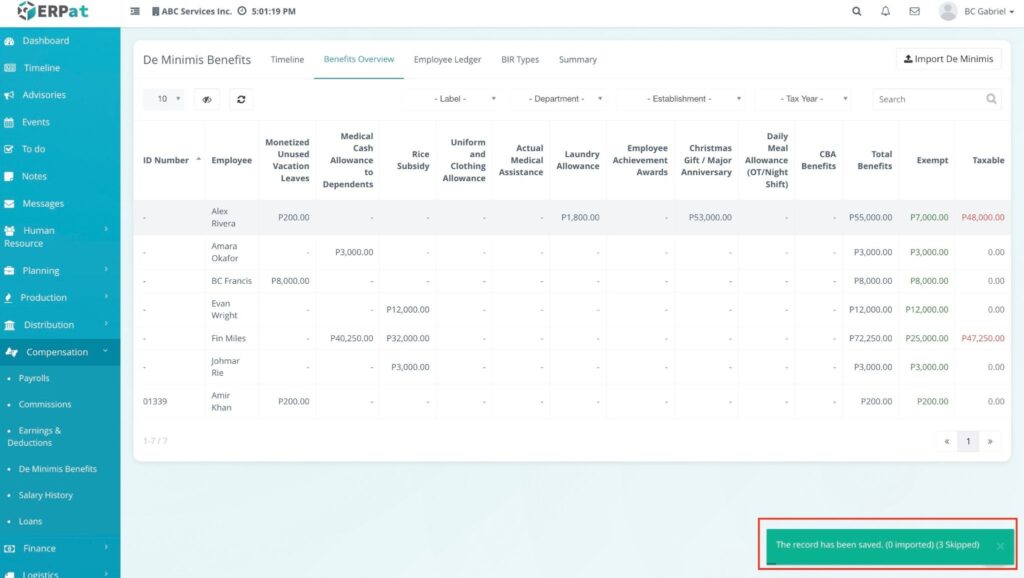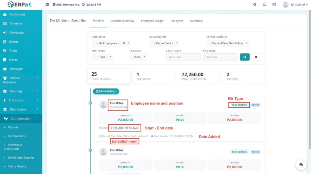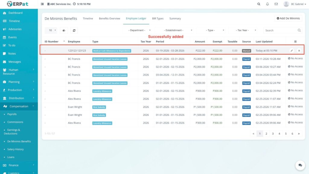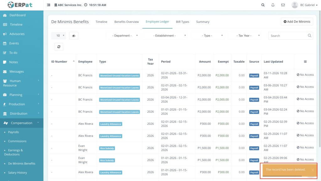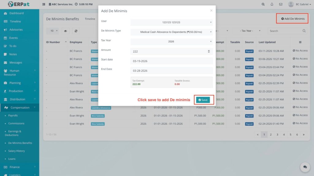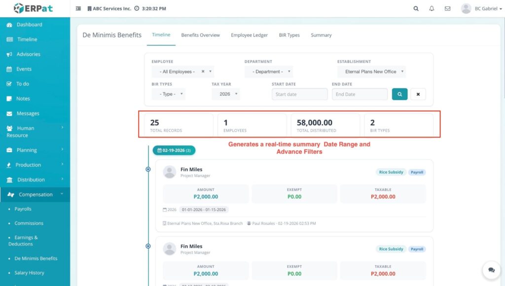 The De Minimis Benefits Module is a specialized payroll tool designed to track and manage small-value, tax-exempt benefits provided to employees. It ensures that the company remains compliant with tax regulations by providing a chronological record of benefits issued—such as rice subsidies, clothing allowances, or laundry allowances—without these being factored into taxable income.