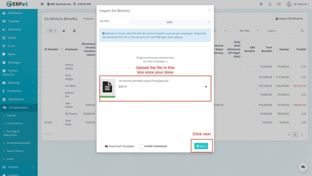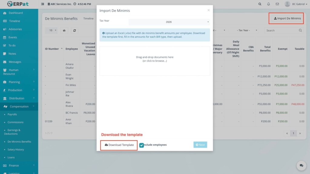 - Import De Minimis: A dedicated button to bulk-upload benefit data into the system.