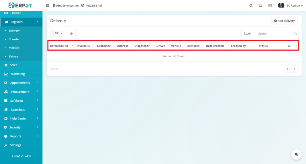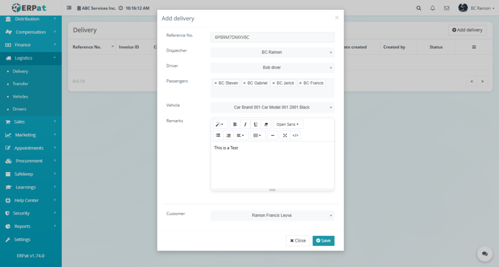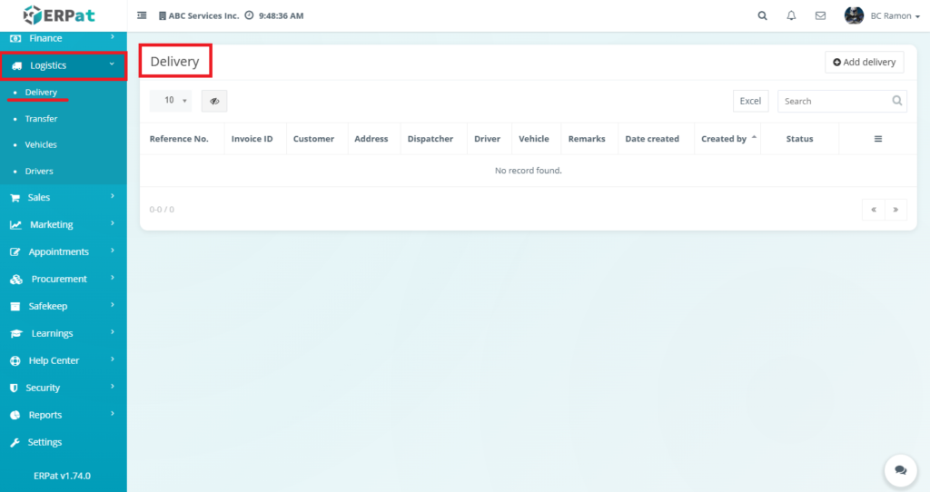 The Delivery Module under Logistics is used to manage and track delivery transactions within the system. It records essential details such as customer information, assigned drivers, vehicles, and delivery status. This module ensures efficient coordination of delivery operations and provides visibility into shipment progress, supporting logistics planning and execution.