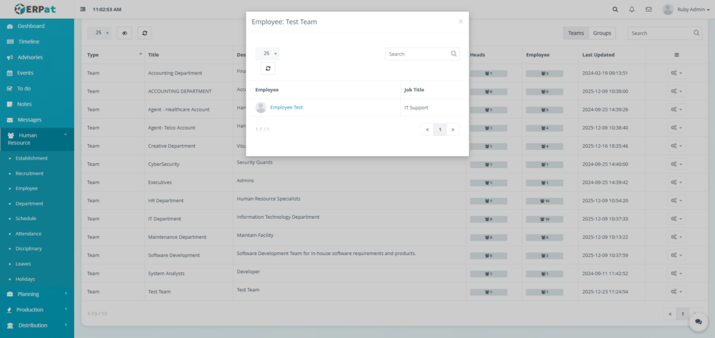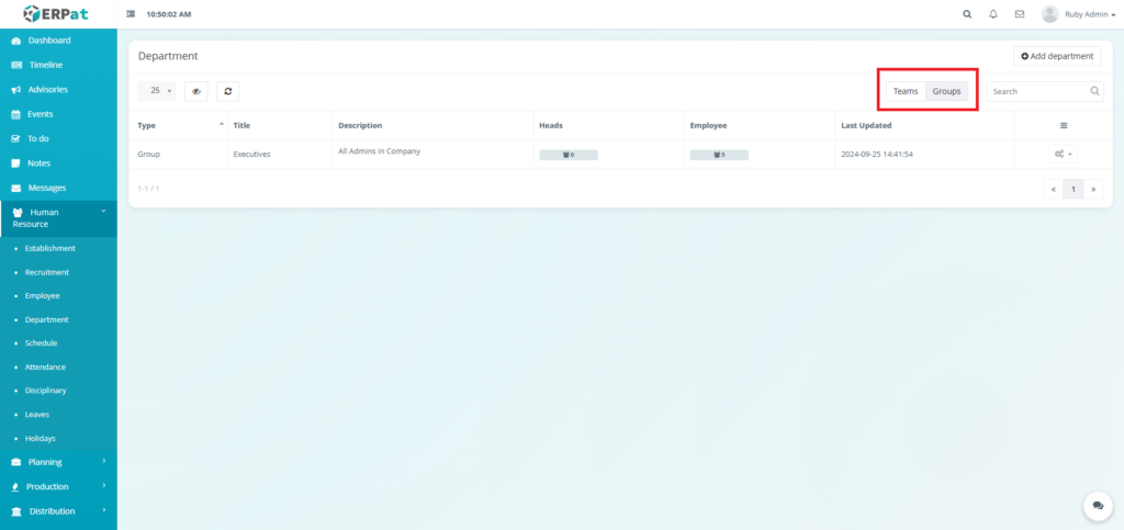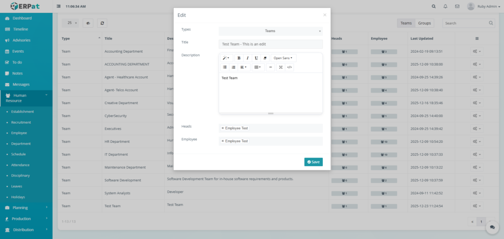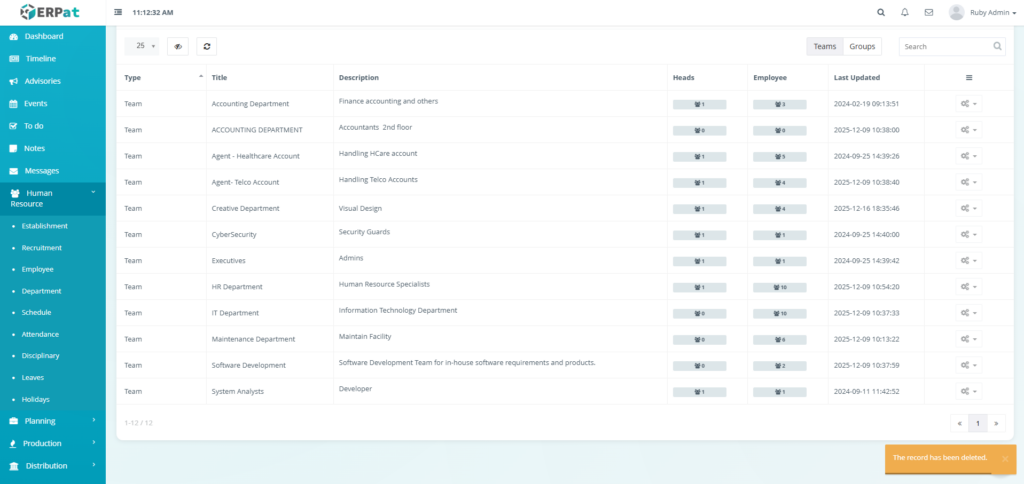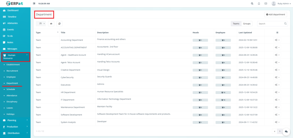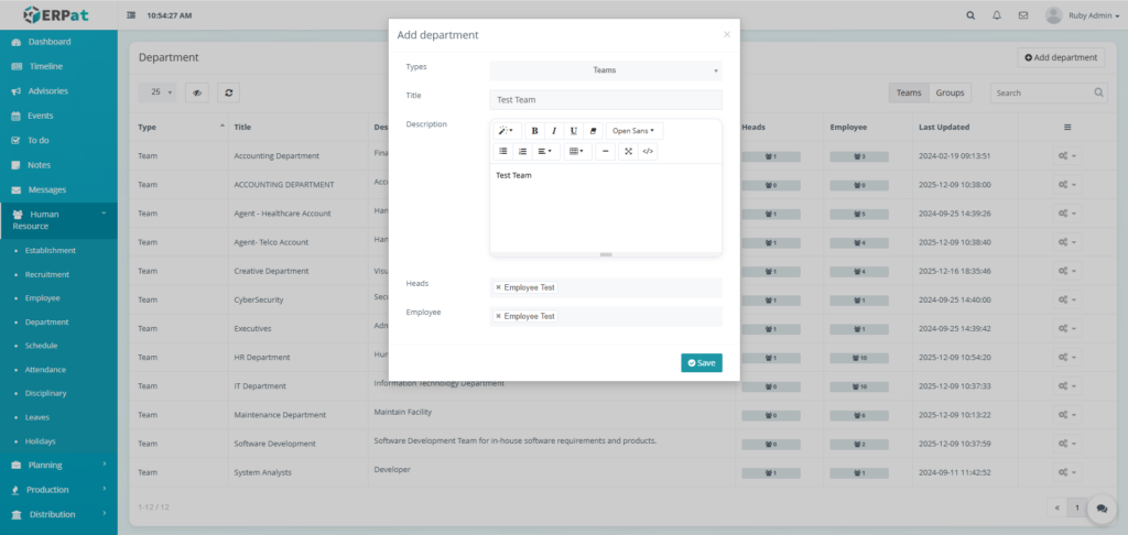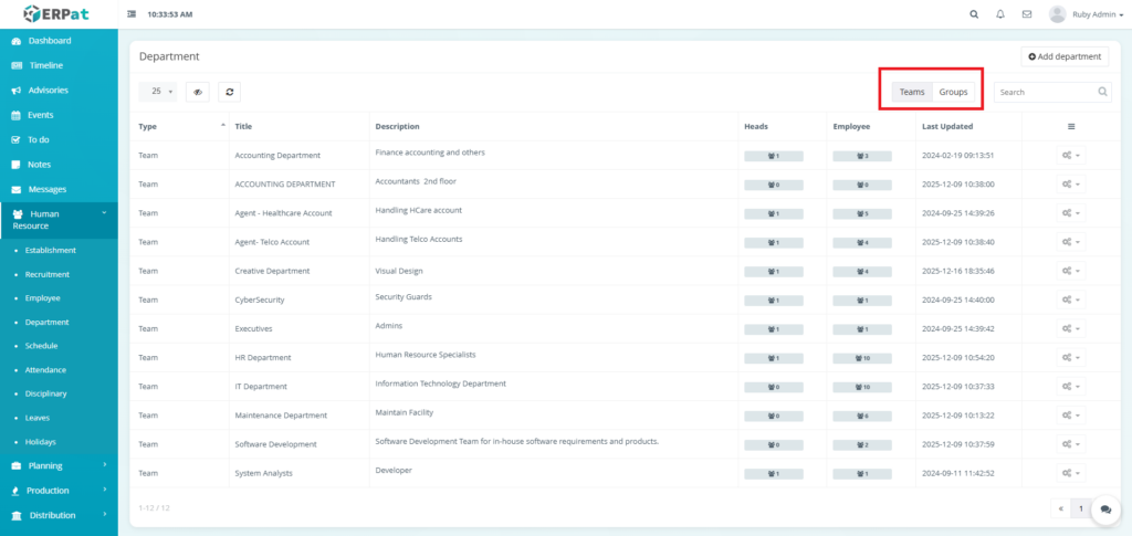 The Department Module is used to organize employees into structured organizational units within the ERPat System. It allows HR and administrators to define Teams and Groups, assign department heads, track employee membership, and maintain clear organizational hierarchy.