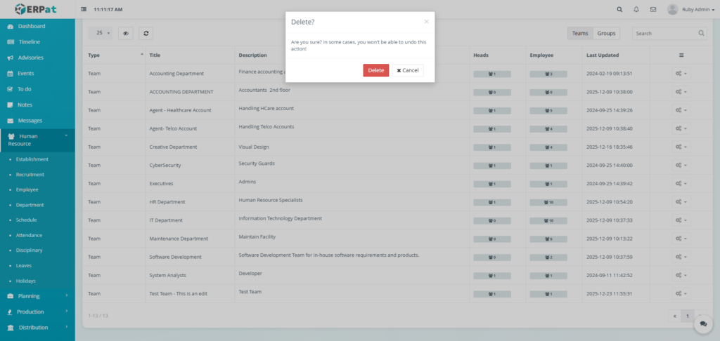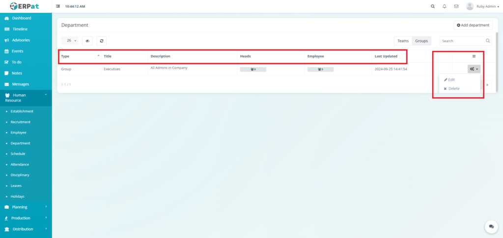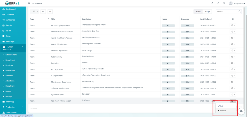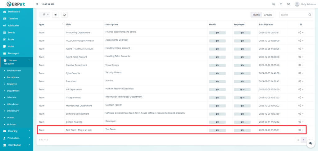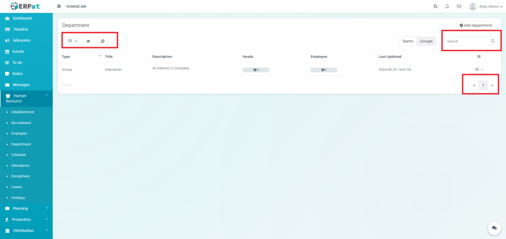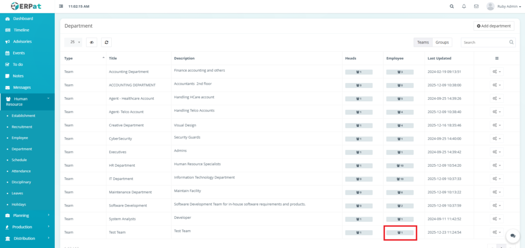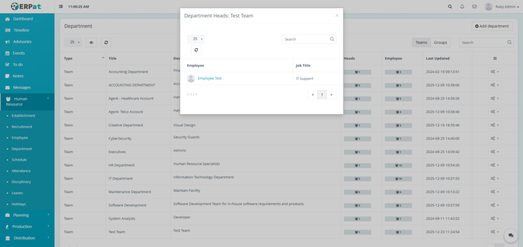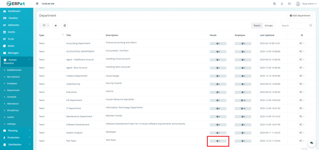 The Department Module is used to organize employees into structured organizational units within the ERPat System. It allows HR and administrators to define Teams and Groups, assign department heads, track employee membership, and maintain clear organizational hierarchy.
