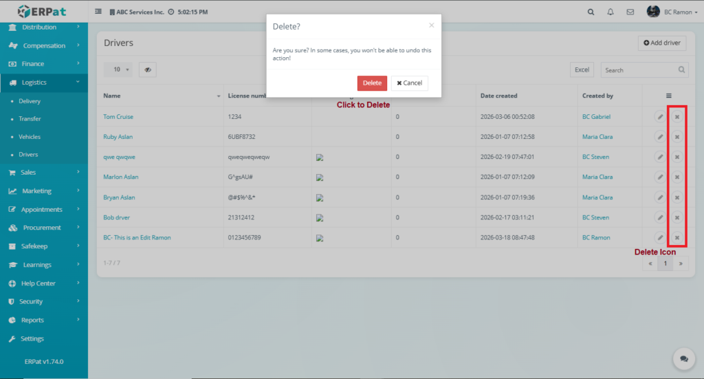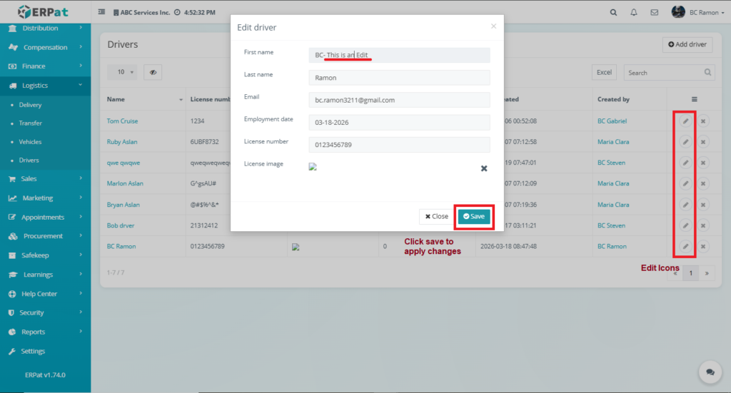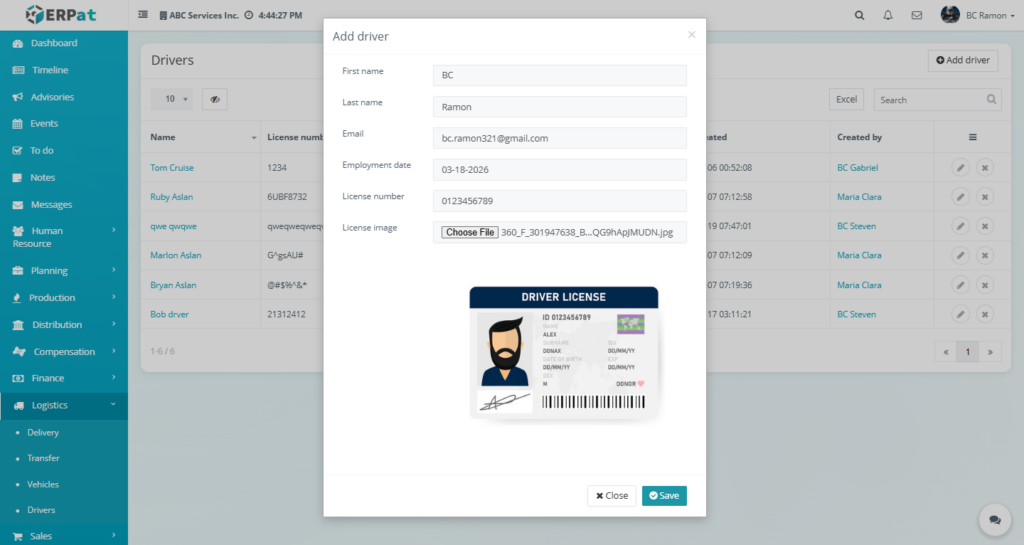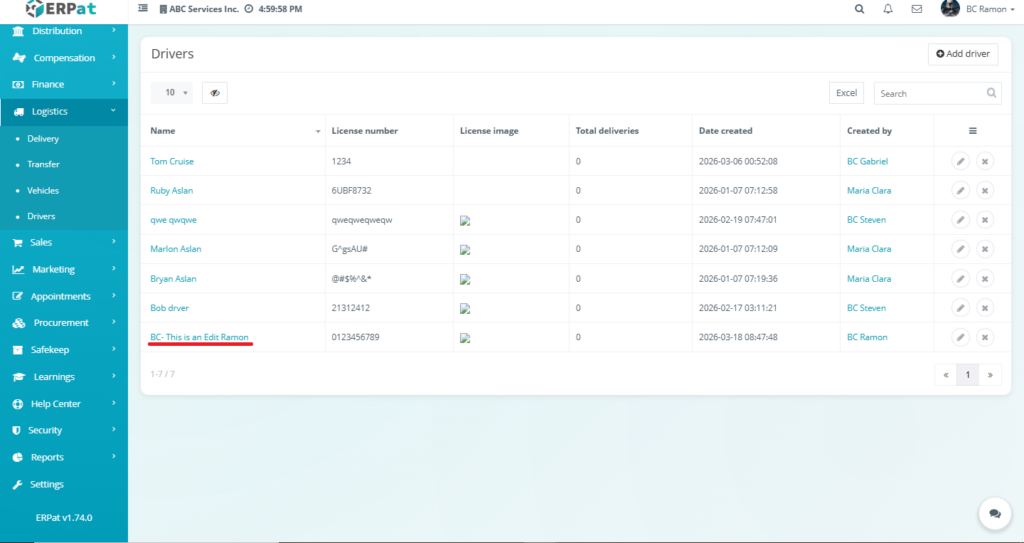 All create, update, and delete actions for driver records are logged for audit and compliance purposes within the ERPat System.