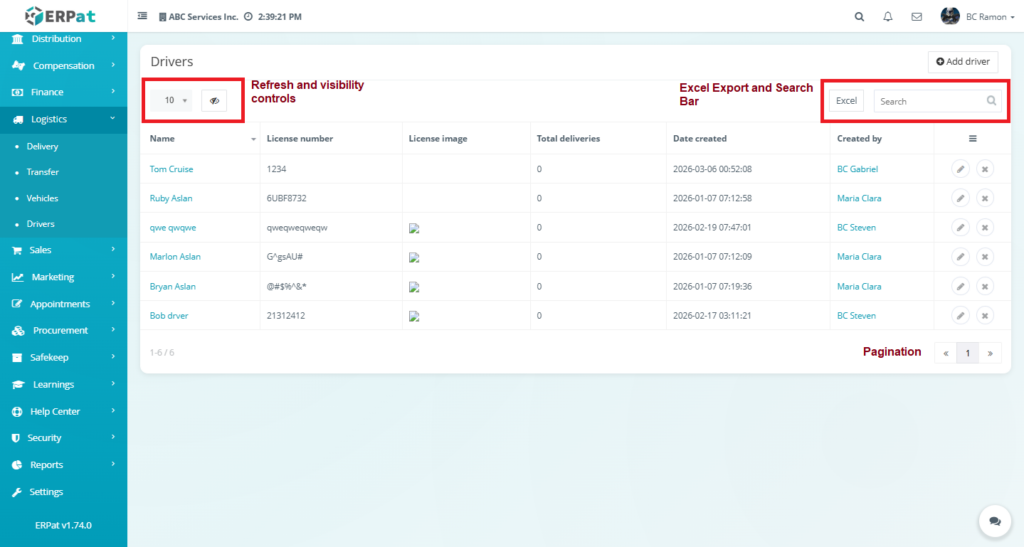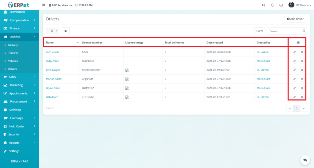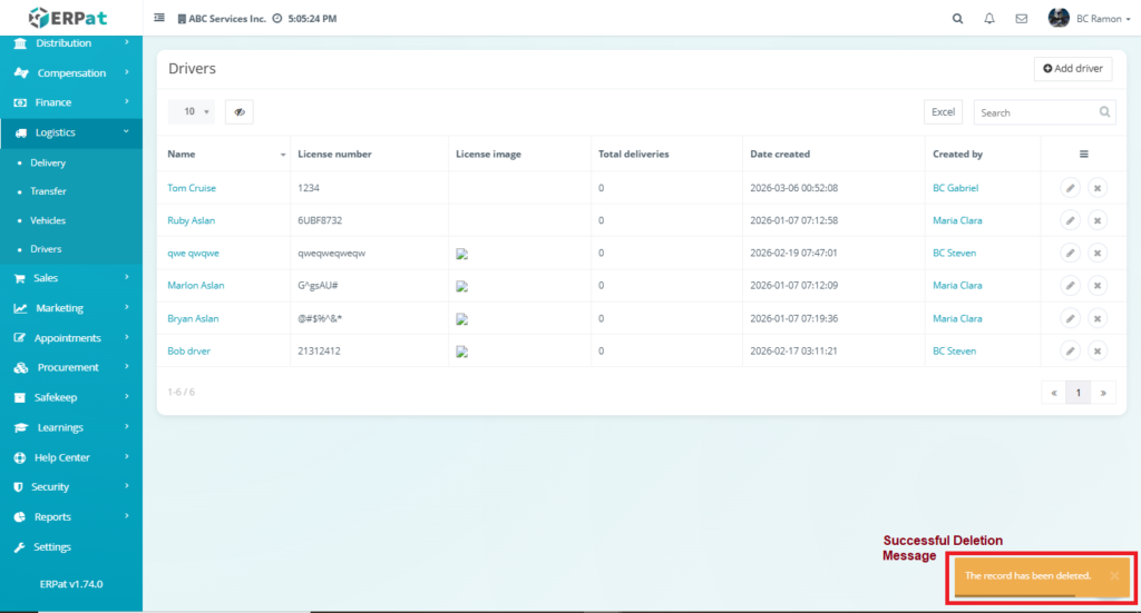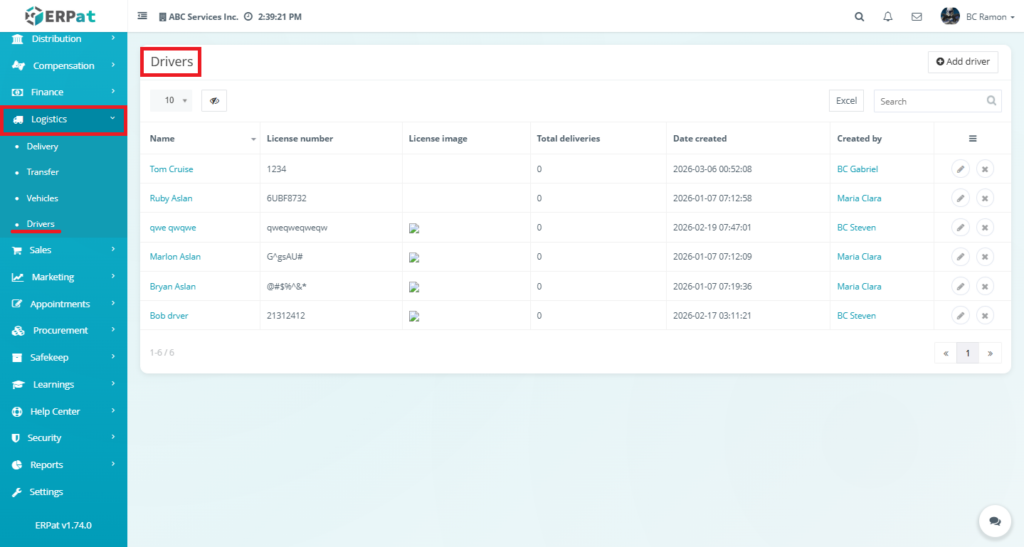 The newly added driver will appear in the listing and will be available for assignment in delivery and transfer operations.