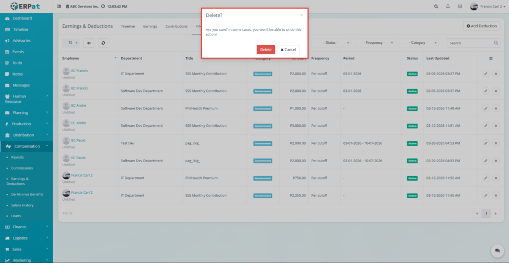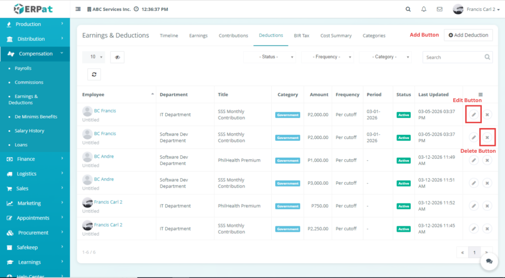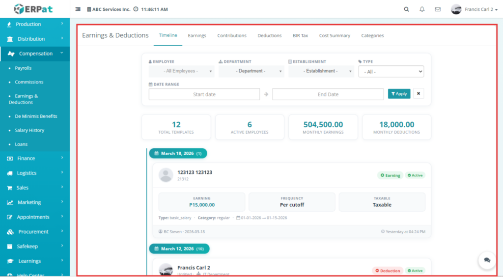 This section displays a list of all earnings and deductions that have been assigned to employees. It works like an activity log where users can easily track when a specific earning or deduction was added, updated, or applied. Each record includes important details such as the employee name, amount, frequency, category, and current status. This helps payroll administrators quickly review recent changes and verify if salary components were properly recorded.