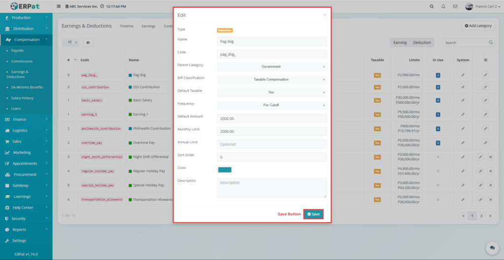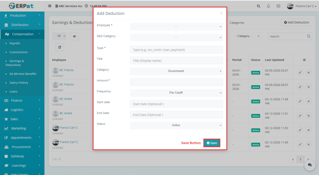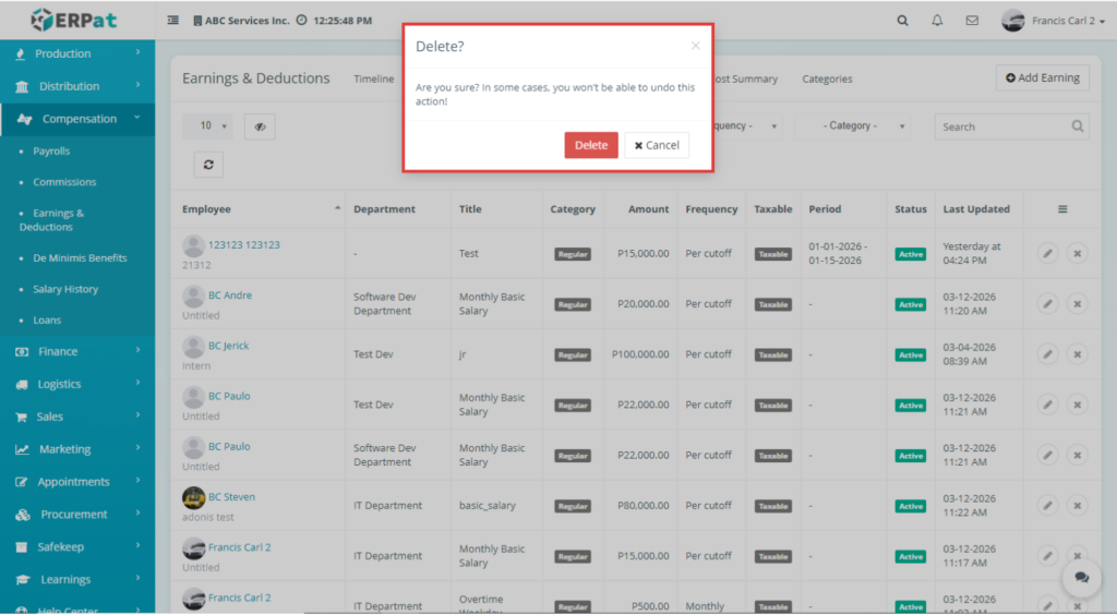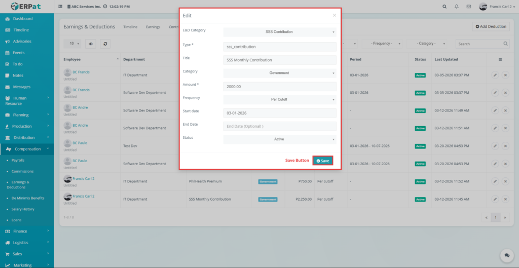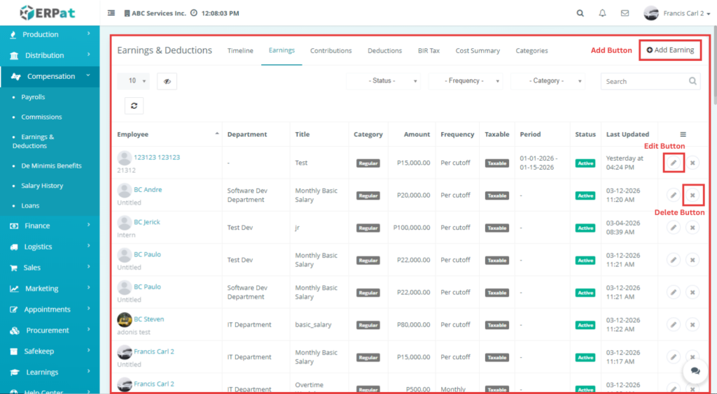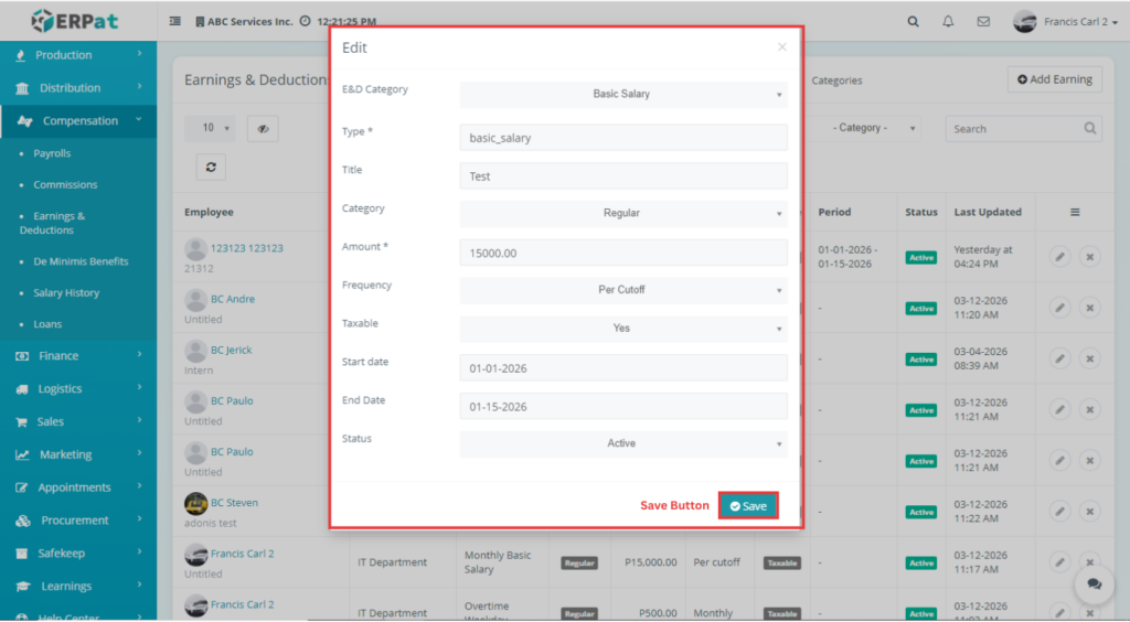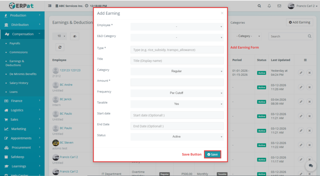 This section allows users to modify or update an existing earning. If there are changes in the amount, category, or frequency, the user can edit the record to ensure that the correct earning value is applied during payroll calculation.
