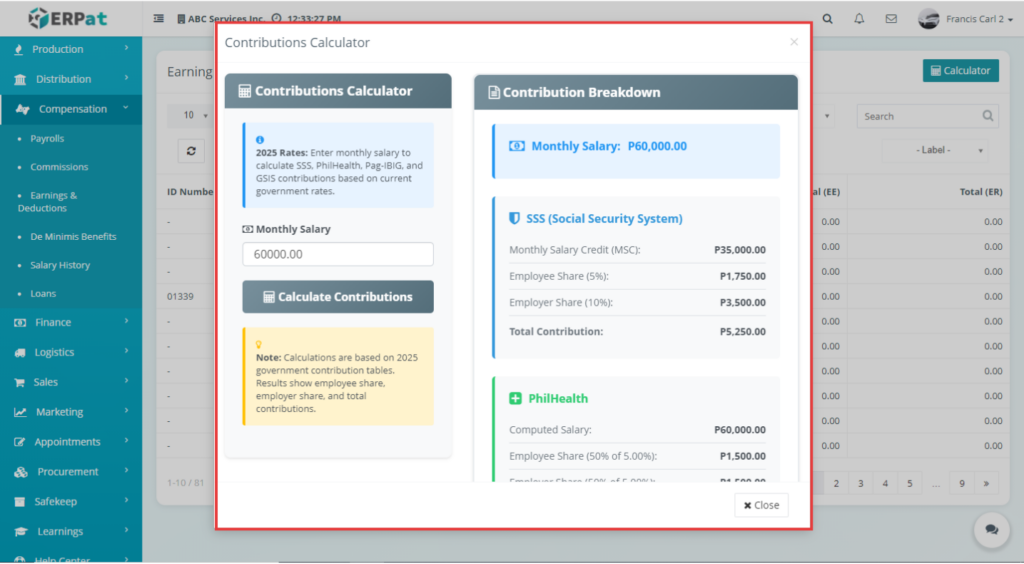 This tool is used to calculate the correct contribution amount based on the employee’s salary. The user inputs the salary, then clicks the “Calculate Contributions” button. The system will automatically compute the total contributions, including the employee share and employer share.