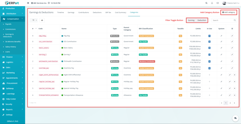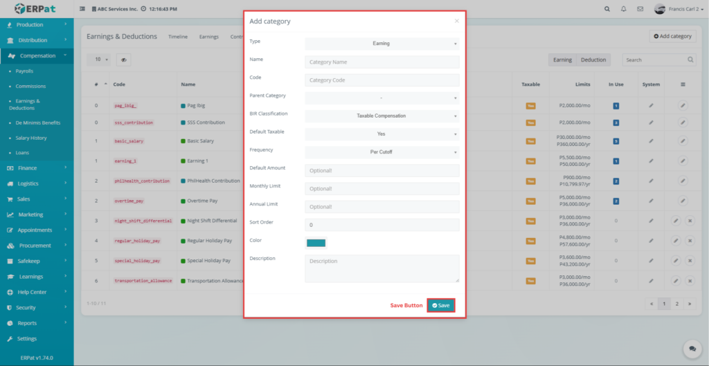 This section is used to organize earnings and deductions into categories. Categorizing helps in structuring payroll data, making it easier to manage, filter, and generate reports. These categories are later used when adding earnings and deductions.
