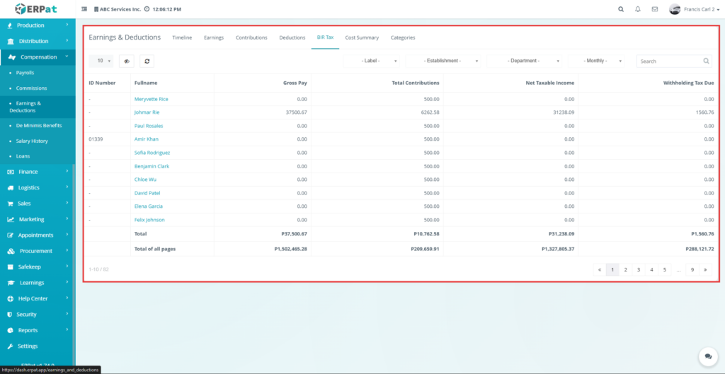 This section displays the tax-related details of employees based on their salary and contributions. The system automatically calculates the necessary values needed for tax computation, including gross pay, total contributions, net taxable income, and withholding tax. These values are used to ensure compliance with government tax regulations.