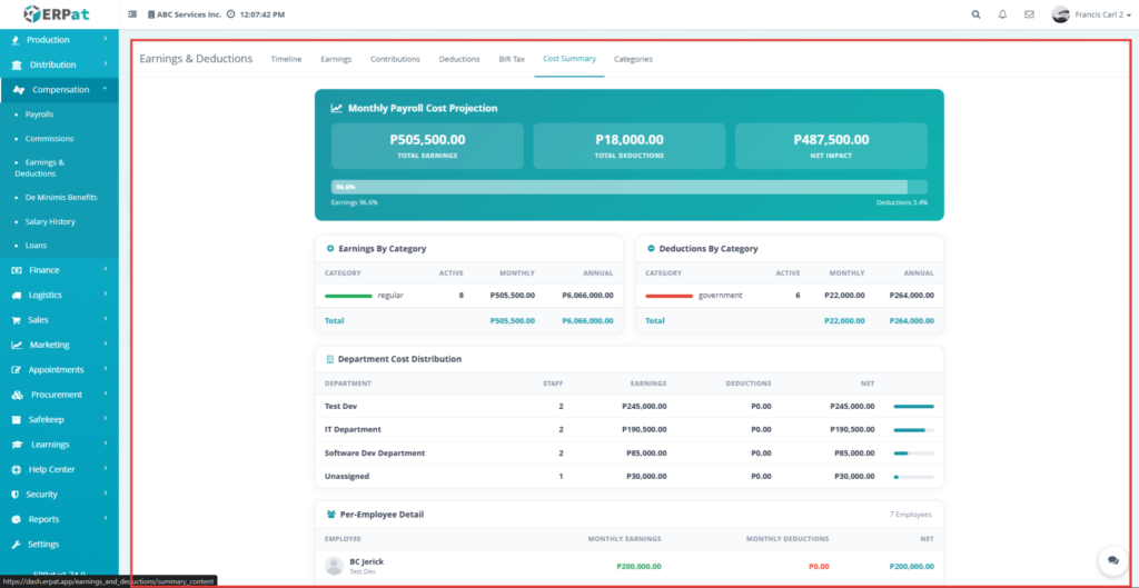 This section provides a summary of the company’s payroll expenses. It shows the total earnings, total deductions, and overall payroll cost. This helps management understand how much the company spends on employee compensation.