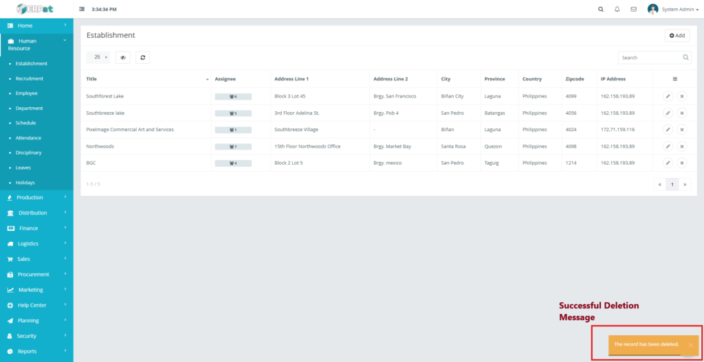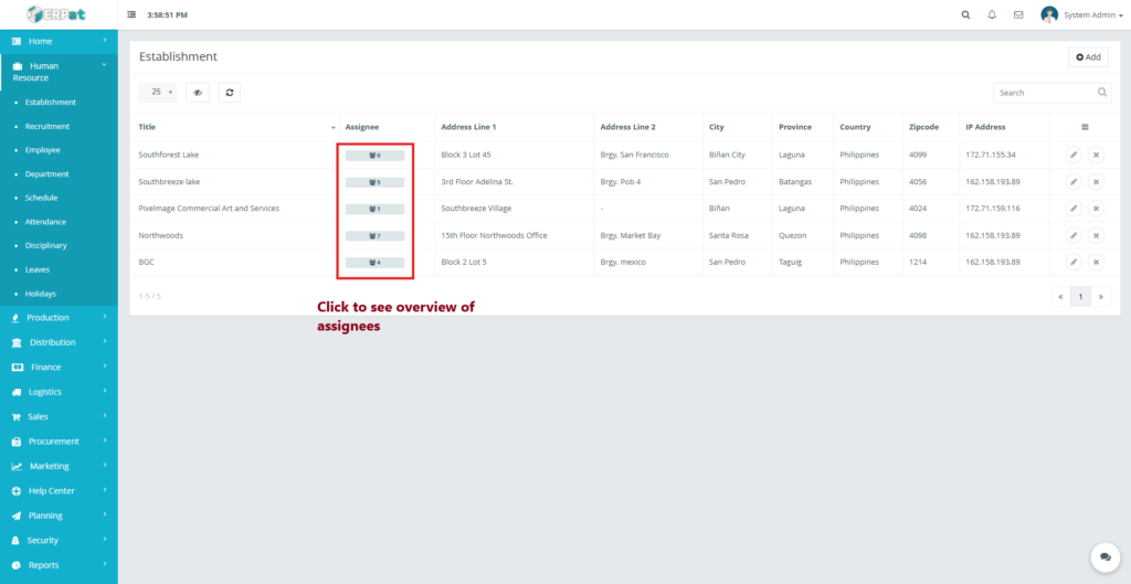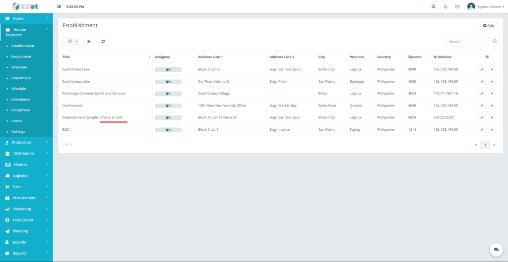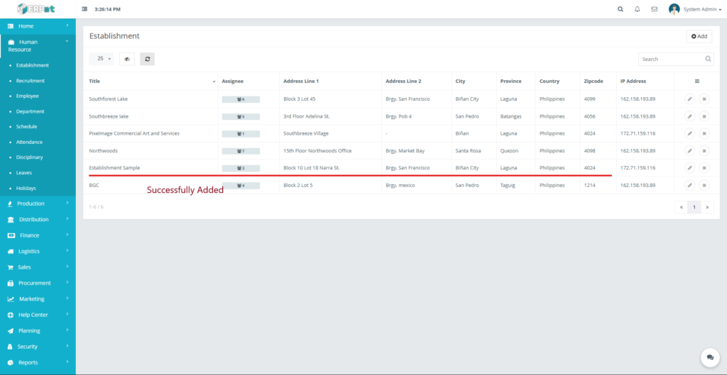 The newly added establishment will appear in the listing and become available for employee assignment.