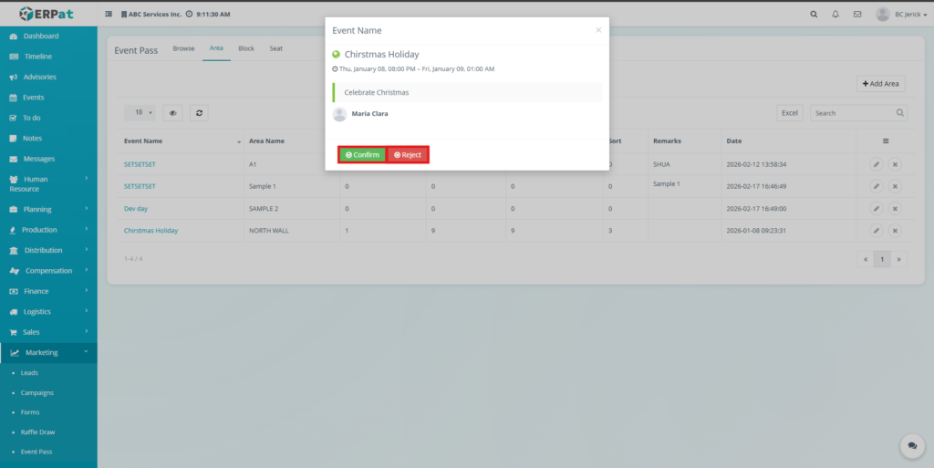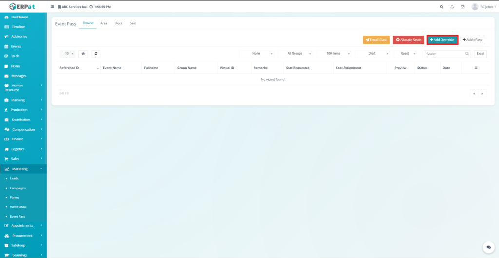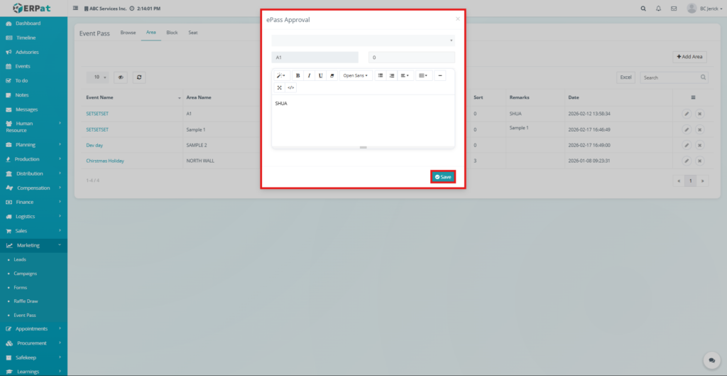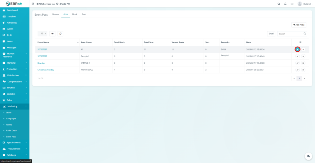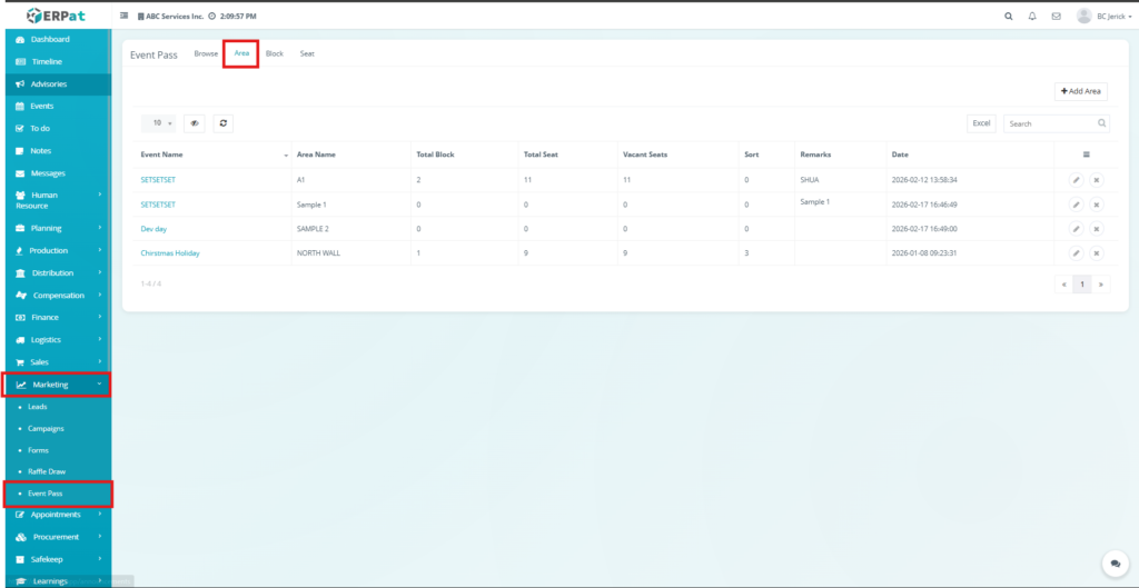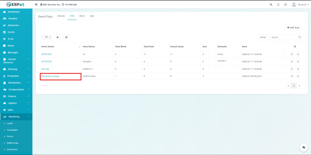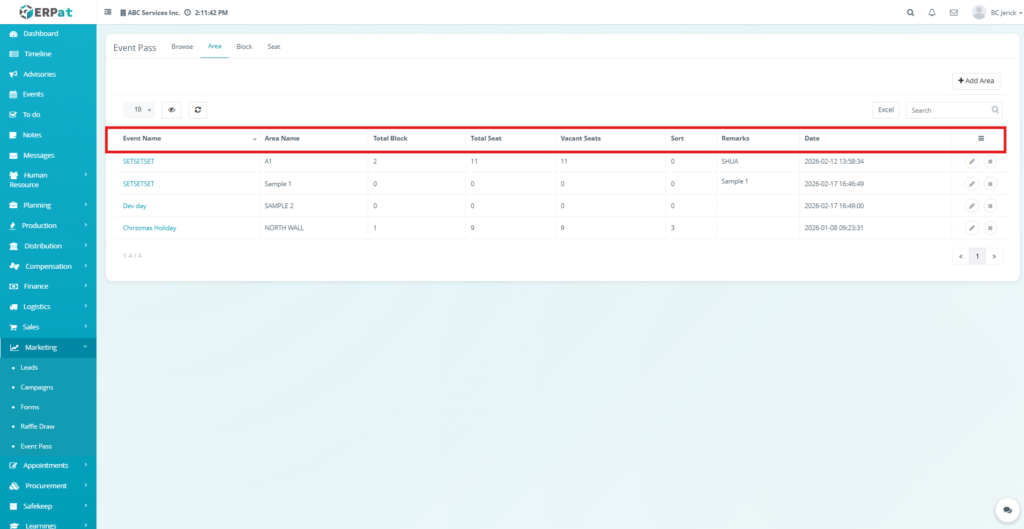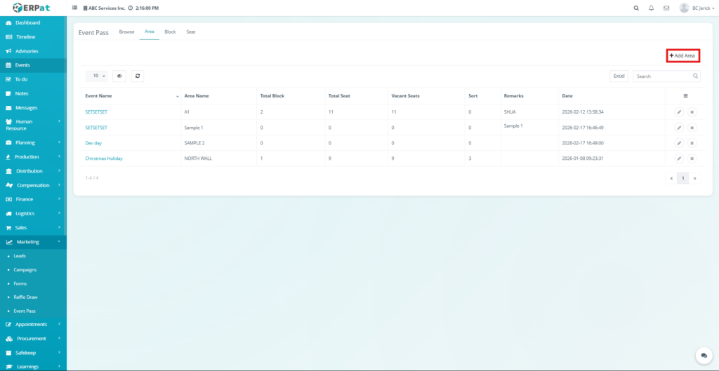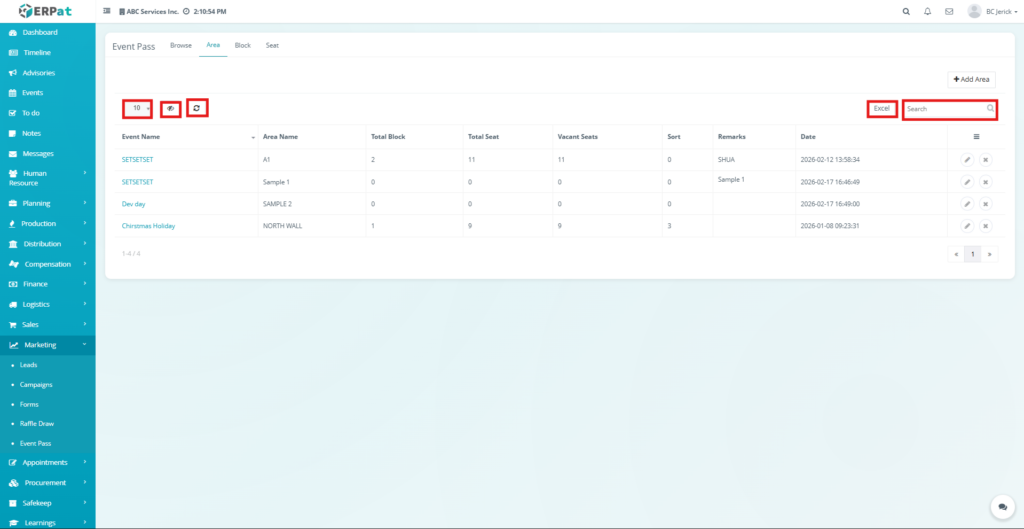 - Click the Area tab located at the top of the Event Pass module.