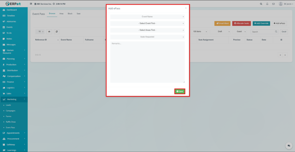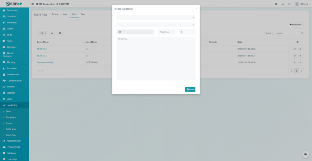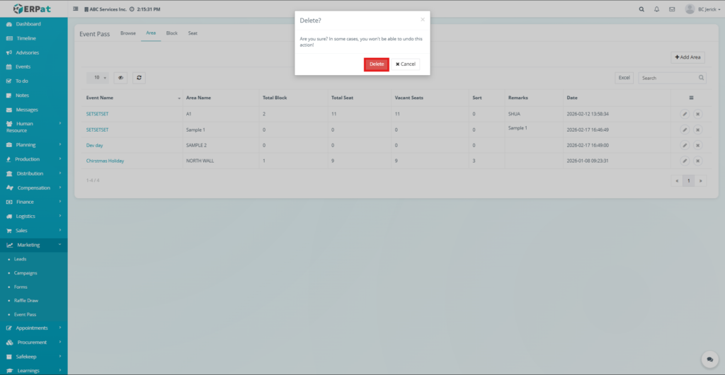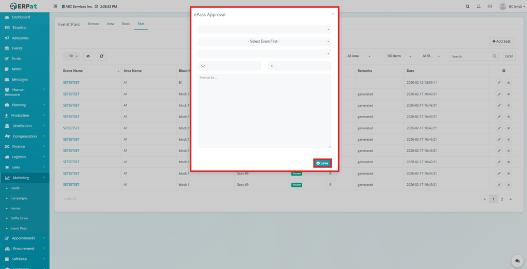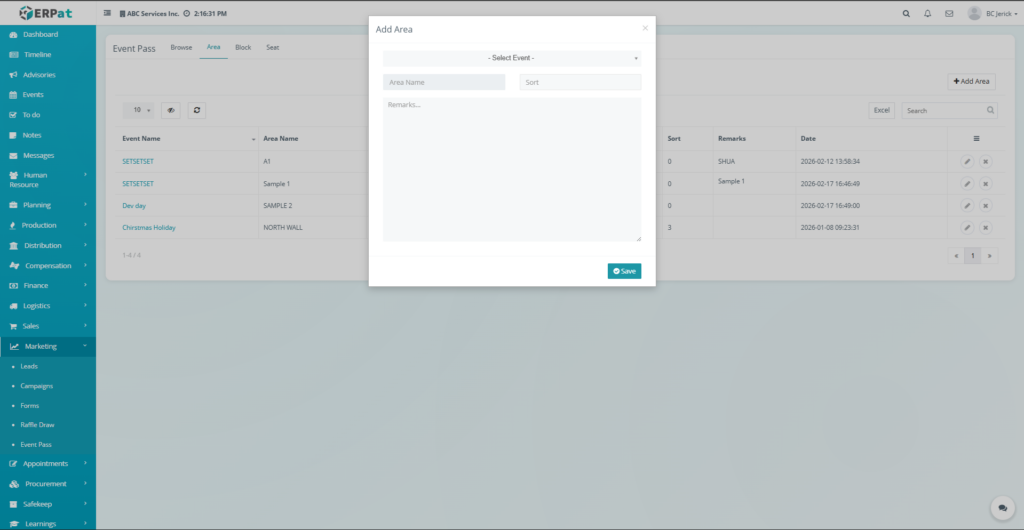 The Event Pass Area Tab is used to configure and manage seating areas associated with events within the ERPat system. It allows administrators to define different seating zones or sections where event attendees can be allocated seats.
