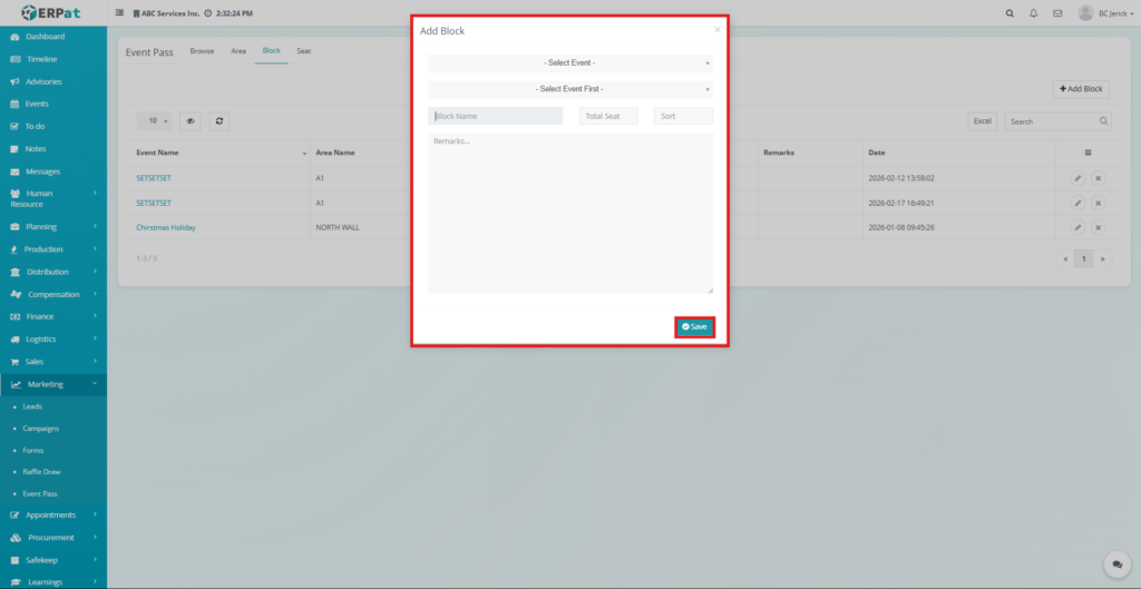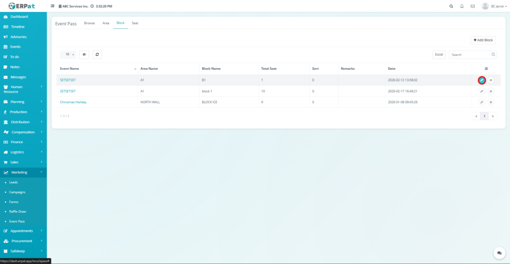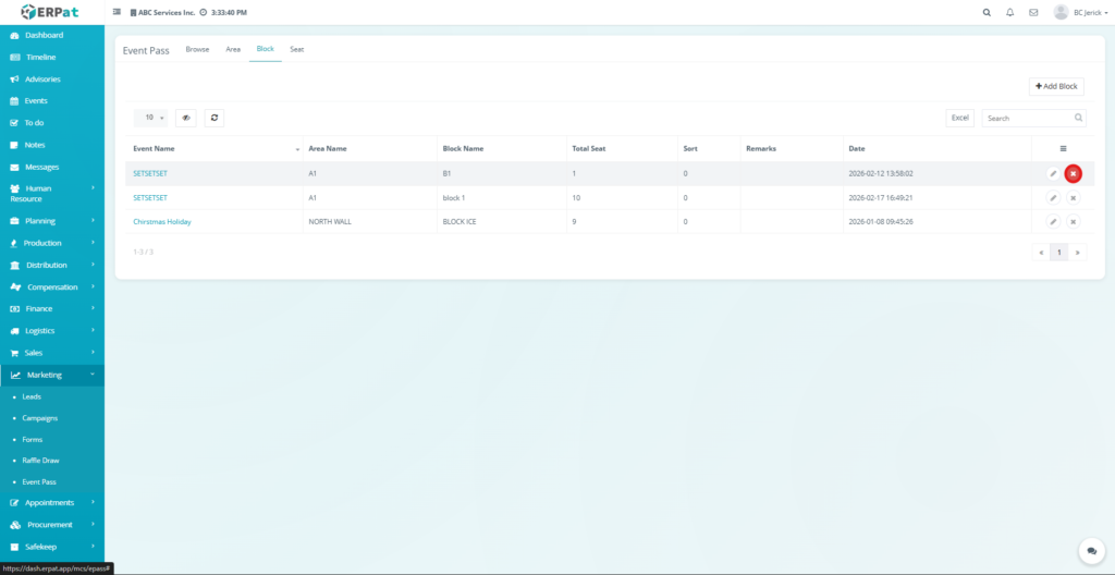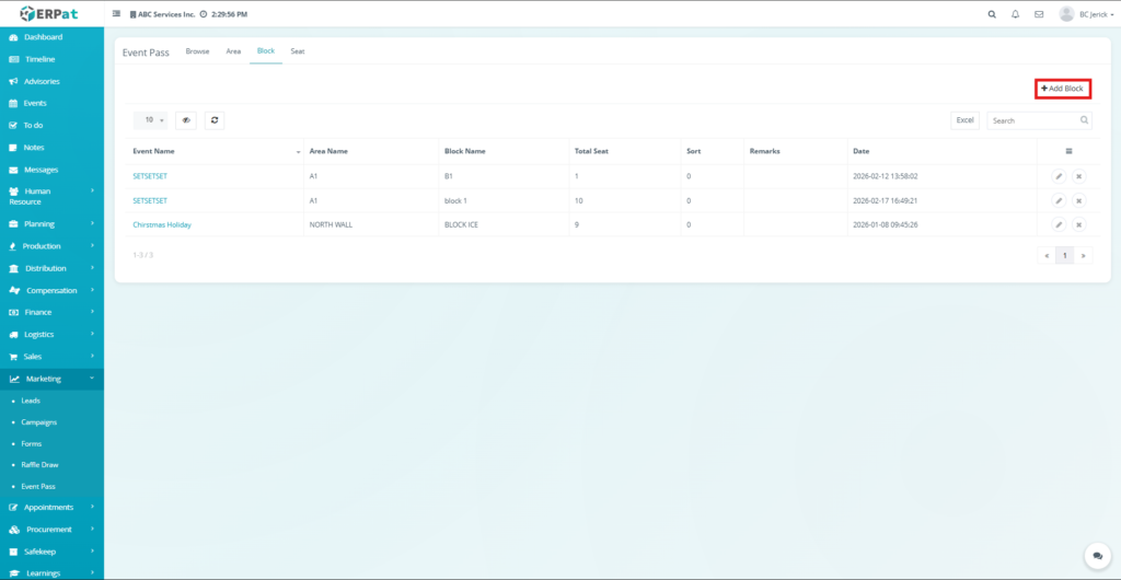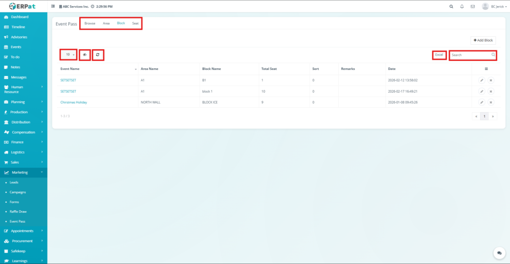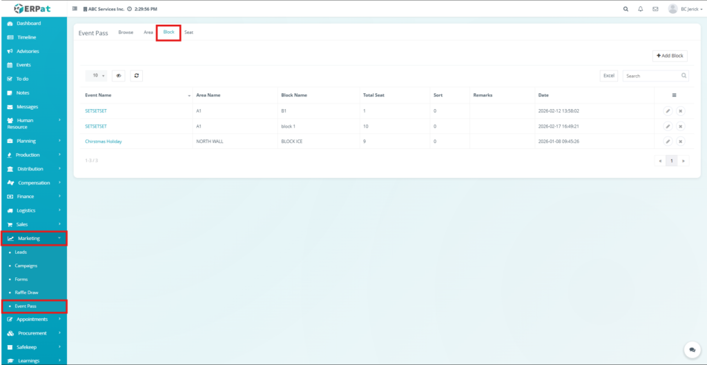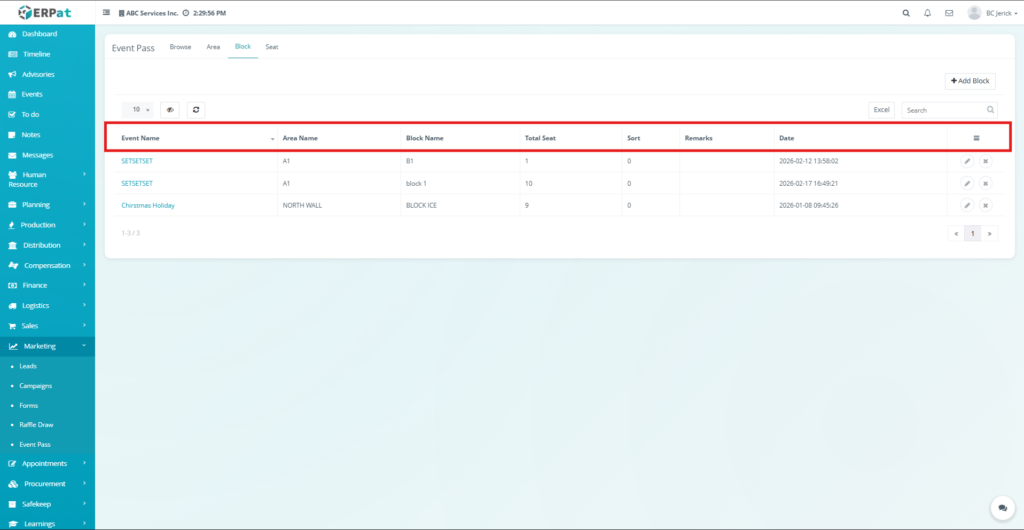 The newly created block will be added to the Block listing table and will be available for seat configuration.