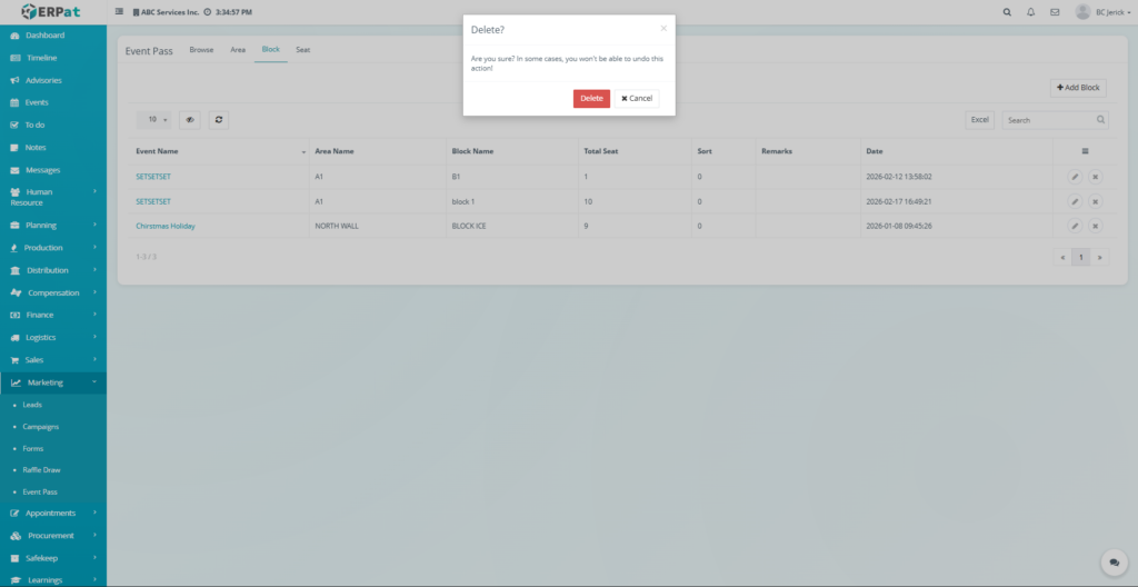 - Blocks that contain configured seats may be restricted from deletion depending on system rules.