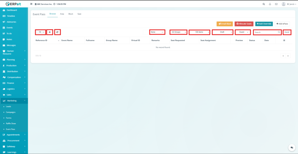 Users can easily locate records within the Event Pass module using the available search and filtering tools. These tools help administrators quickly find event pass information, seating configurations, and attendee records.