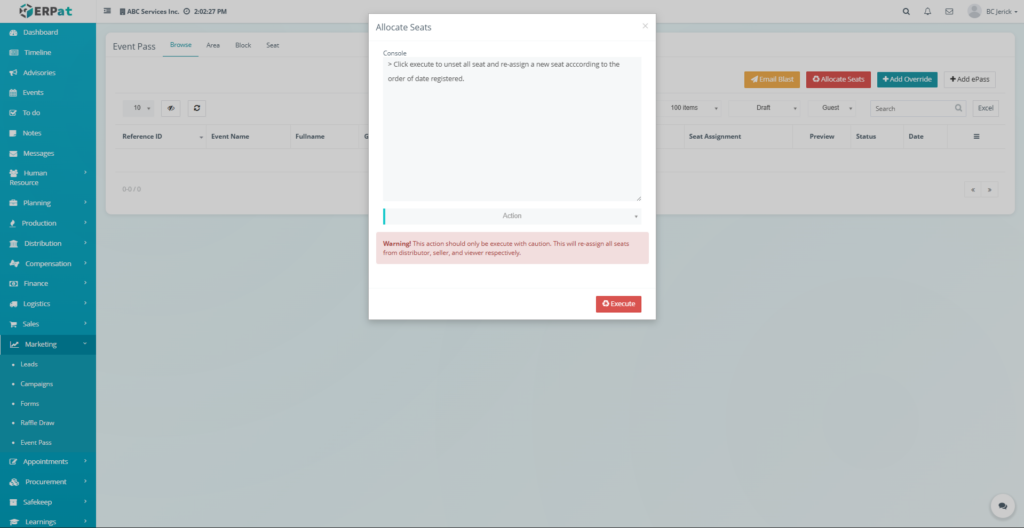 Executing seat allocation will reassign all seats and may override existing seat assignments