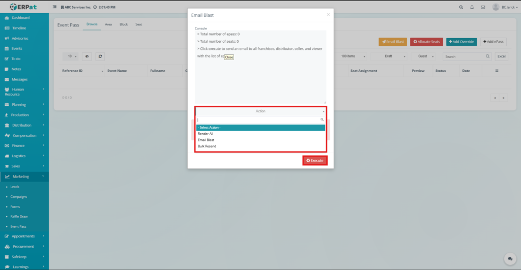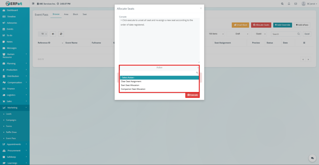 - Click Execute to run the seat allocation process.