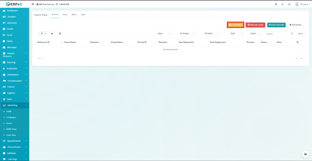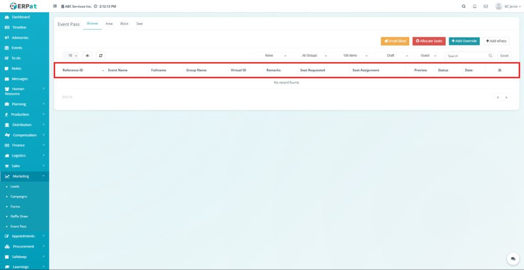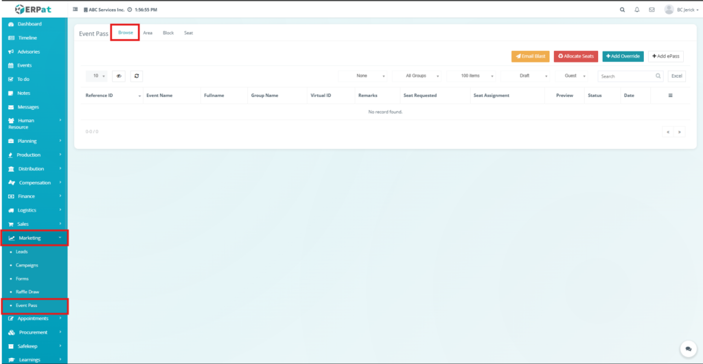 The Event Pass Browse Tab is used to manage and monitor all generated event passes within the ERPat system. It provides a centralized interface where administrators can view, search, filter, and manage ePass records associated with events.