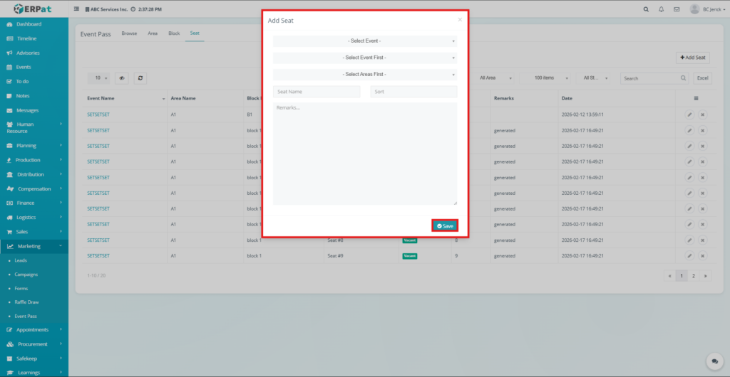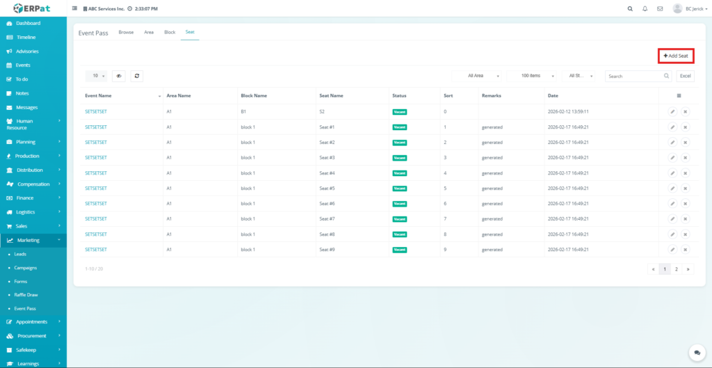 - The new seat record will be added to the Seat listing page and will be available for event seat allocation.