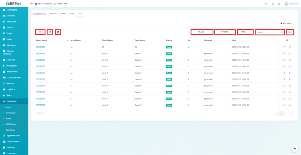 - Pagination controls – Allows navigation through large seat datasets