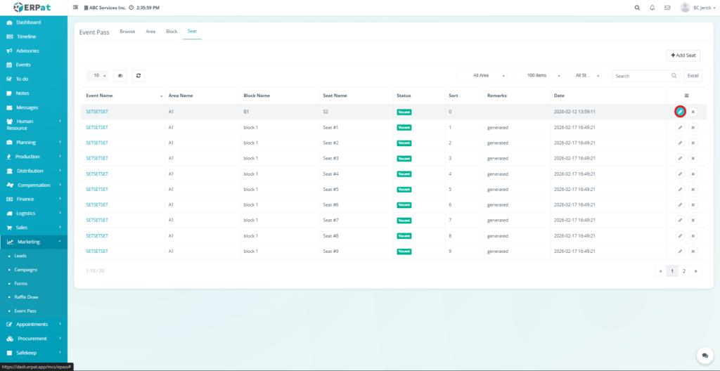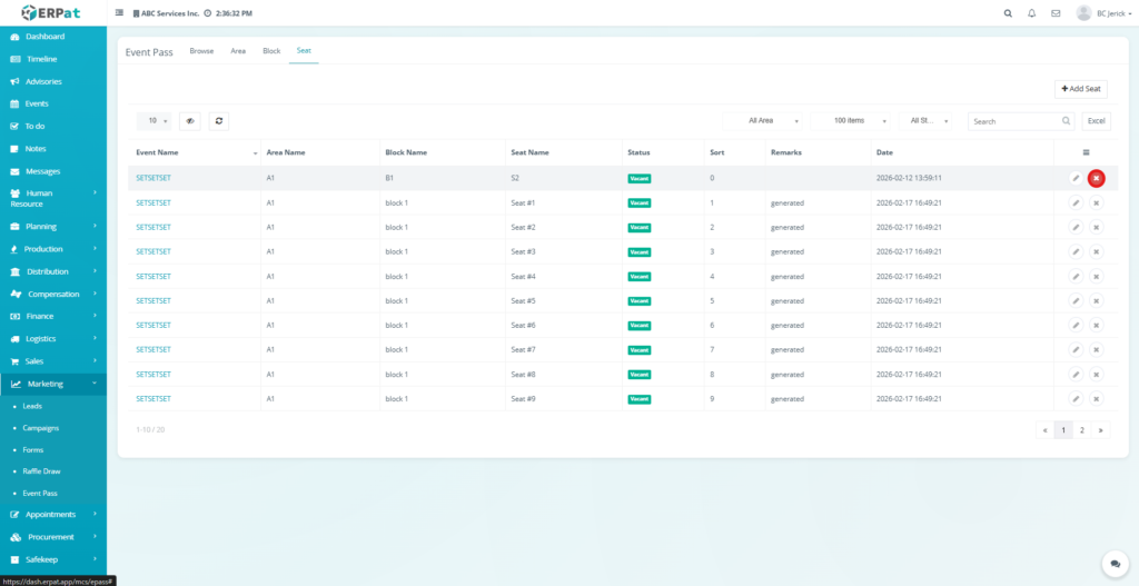 The Seat tab provides tools to create, edit, and delete seat records while displaying seat information such as the associated event, area, block, seat number, and seat status. This module helps ensure that seating arrangements are organized and properly configured for event access management.