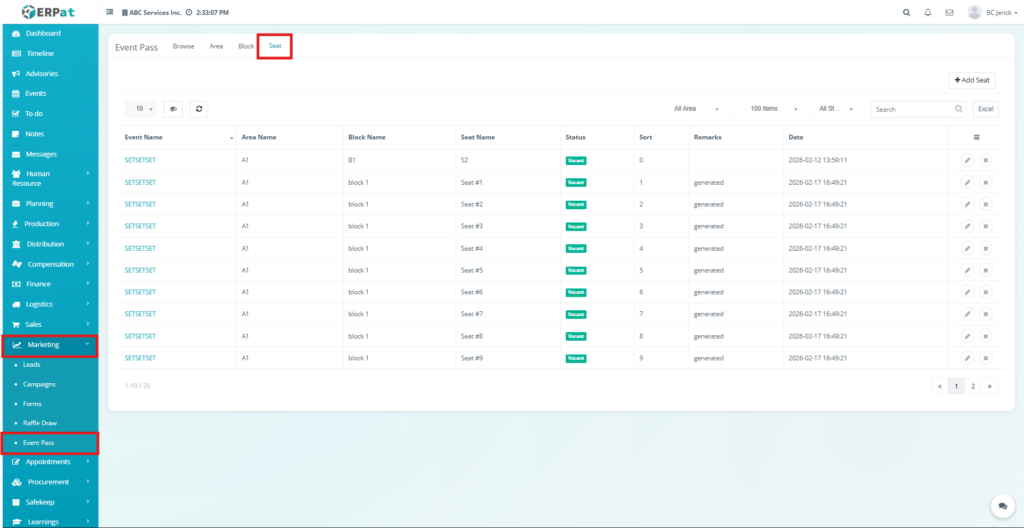 - Click the Seat Tab located at the top of the Event Pass module.