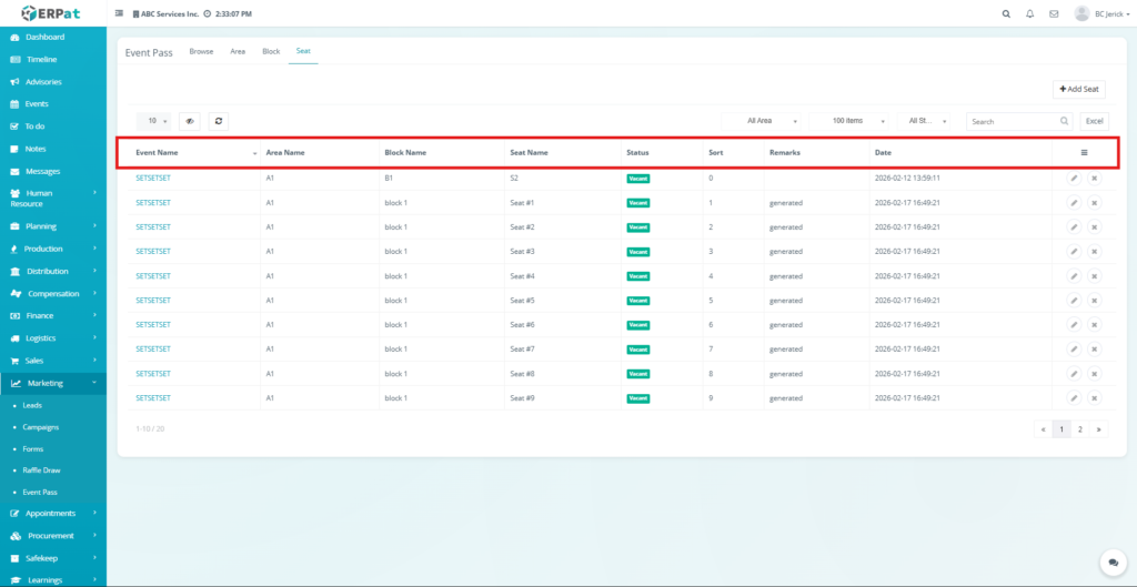- The system will display the list of configured seats.