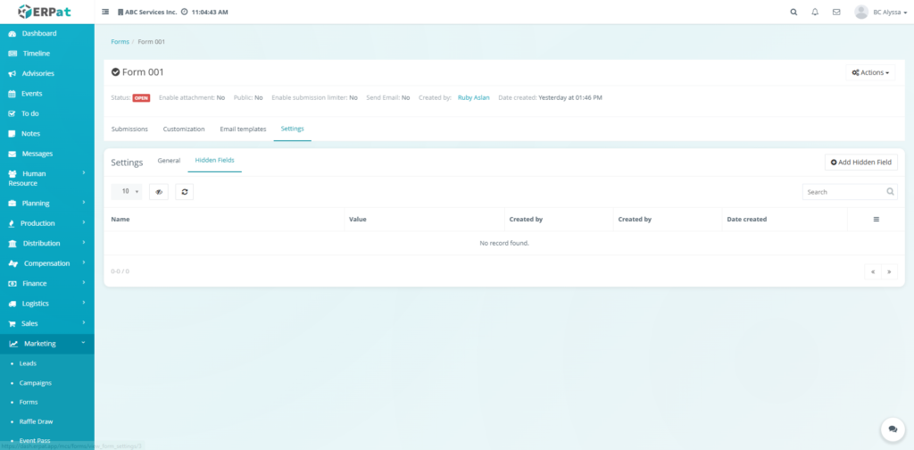 The Forms Module under Marketing is used to create, manage, and monitor digital forms for campaigns, lead collection, surveys, registrations, and other marketing-related activities. These forms serve as structured data collection tools that help marketing teams gather customer information, feedback, and engagement details. Each form record contains configuration and visibility settings, ensuring consistent usage across campaigns and external integrations.