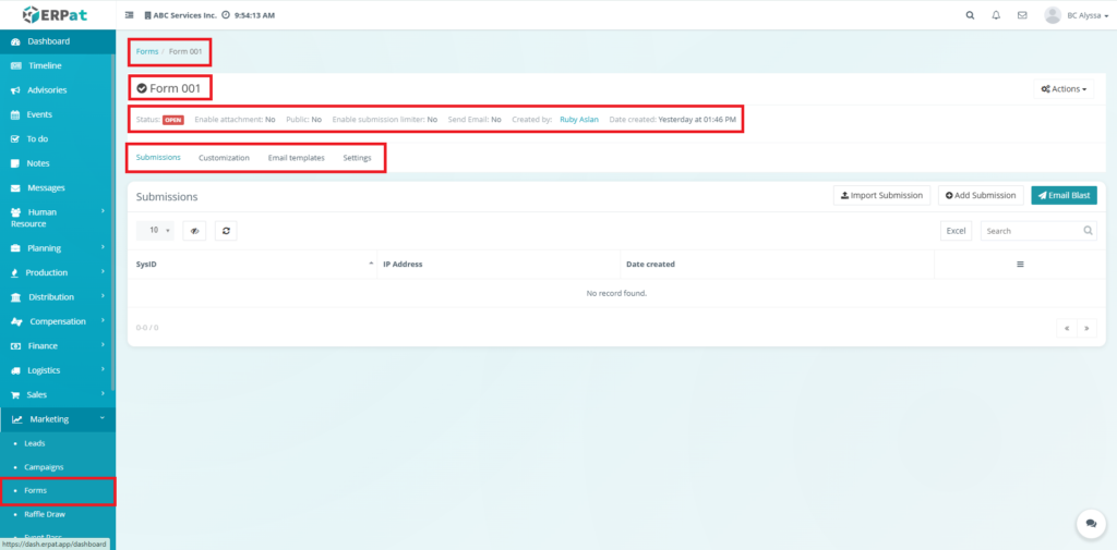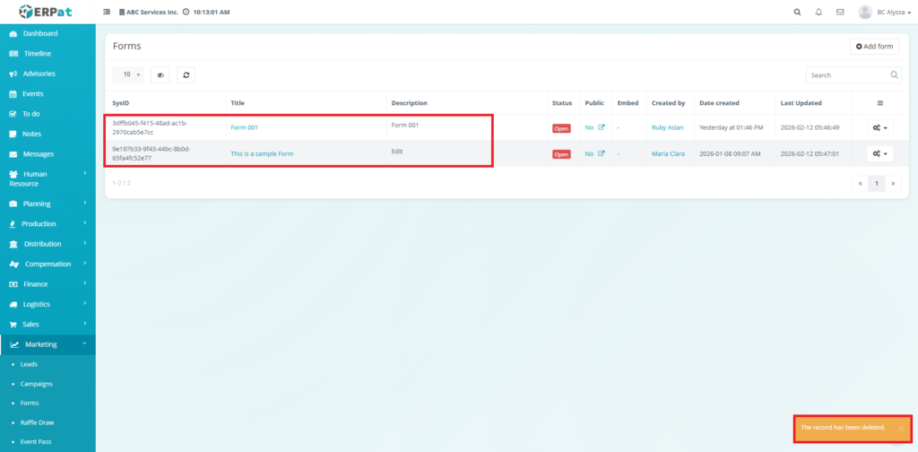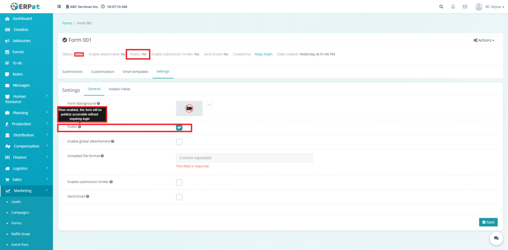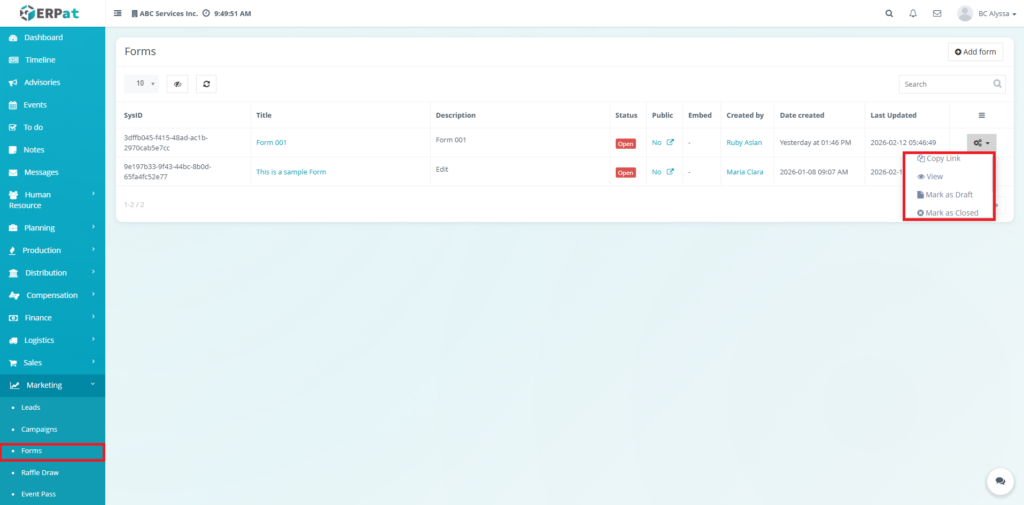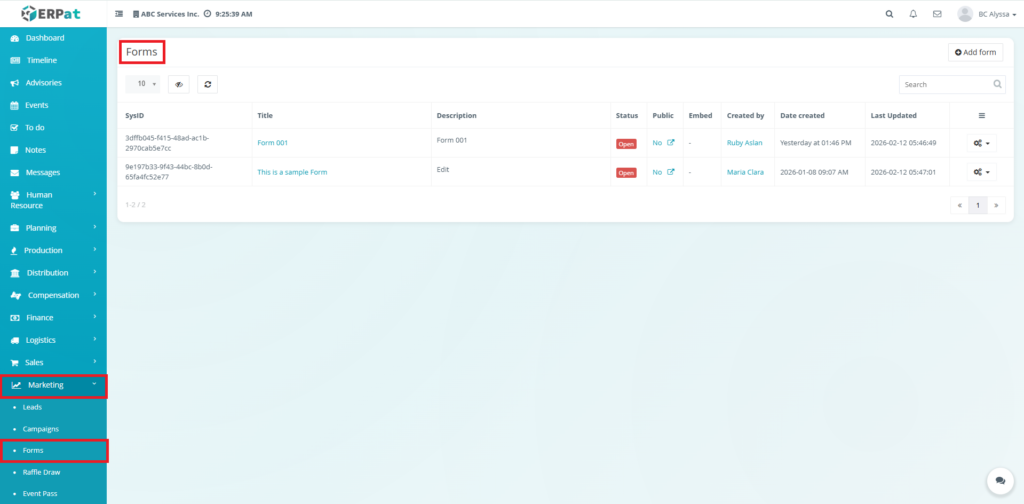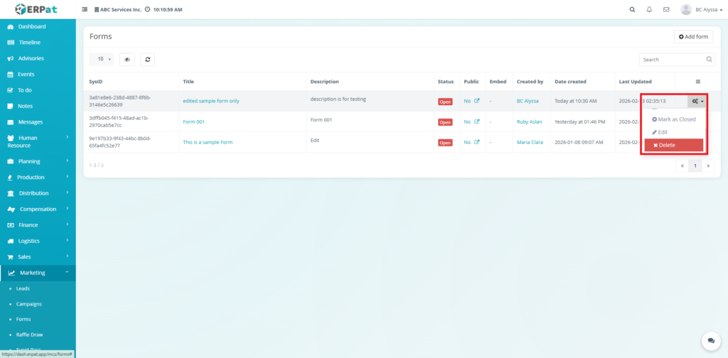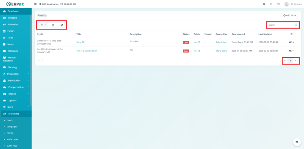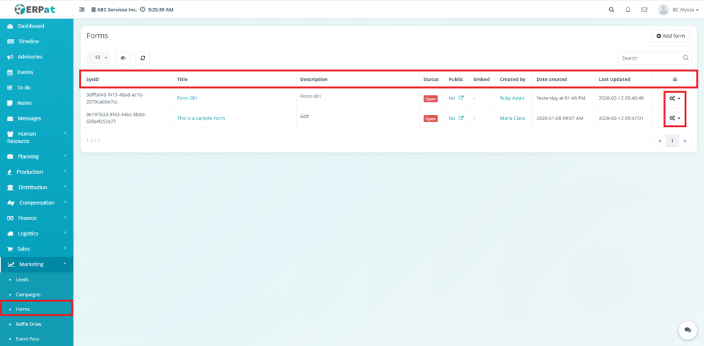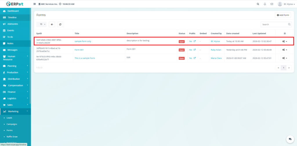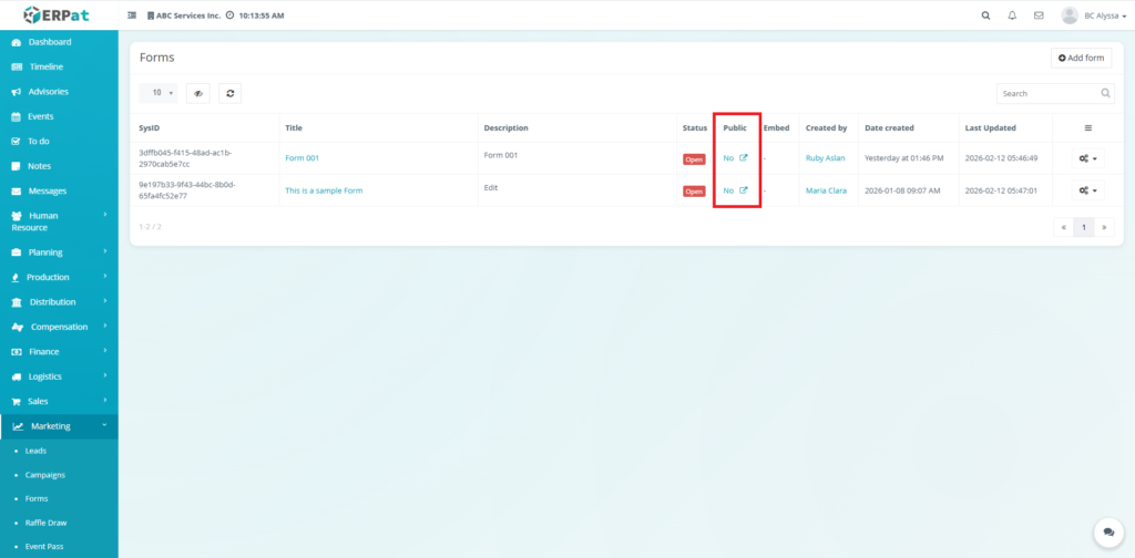 - Public – Shows if the form is publicly accessible (Yes/No)