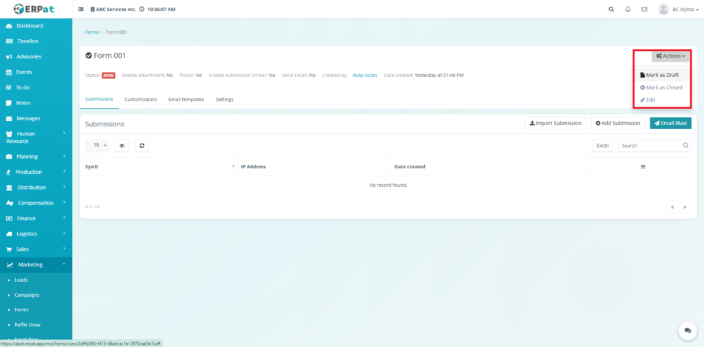 - Mark as Draft – Sets the form to a draft state, typically used for forms still under development.